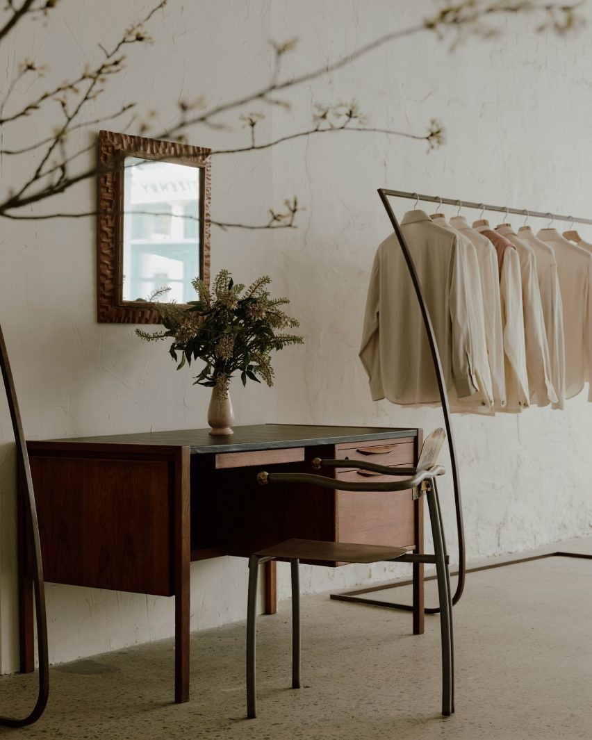 전면 공간은 거의 대칭적으로 나뉘어 있으며, 작은 탈의실 앞에 두 개의 가느다란 행거가 배치되어 있습니다. 한쪽에는 빈티지 나무 책상과 거울, 금속 좌석 의자가 조화를 이루고 있습니다. 반대쪽에는 바닥에서 천장까지의 거울과 재스 우드 벤치가 배치되어 있습니다. 이 같은 배치는 공간의 균형감을 주며 각 의상에 충분한 여유를 제공합니다. 전체적으로 갤러리 같은 느낌을 주어 의상에 대한 집중도를 높이고 있습니다.