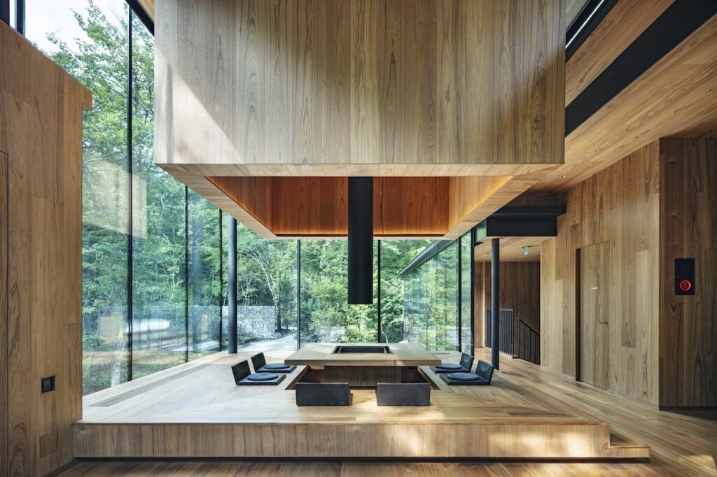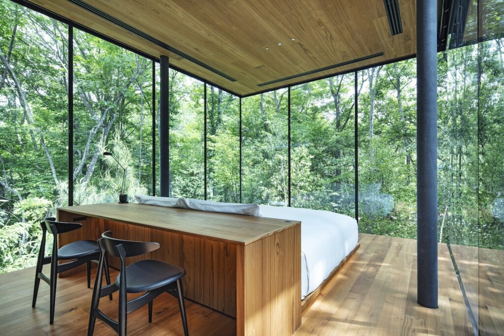 이 호텔은 숲 속에 자리 잡은 비일상적인 공간으로, 마치 나만의 거실처럼 느껴지는 체류 경험을 제공합니다. 총 면적 326.02㎡의 공간에는 두 개의 침실과 여유로운 거실 겸 식당이 마련되어 있어 최대 8명까지 숙박이 가능합니다. 특히, 삼면이 유리로 둘러싸인 거실은 북카루이자와의 자연을 충분히 만끽할 수 있는 최고의 장소입니다. 큰 이로리(囲炉裏, 일본 전통 난방 장치)가 상징적으로 놓여 있어, 계절에 따라 변화하는 풍경을 즐기며 따뜻한 시간을 보낼 수 있습니다. 이 공간은 가족이나 친구들과 함께 편안한 휴식을 취할 수 있는 완벽한 장소입니다.