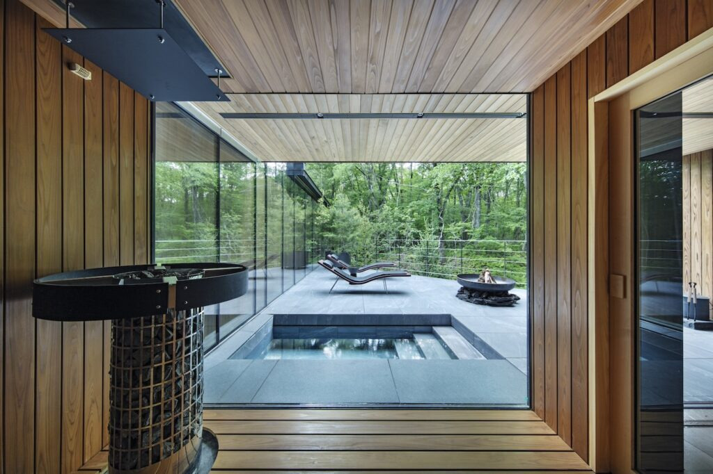 외부 경치를 바라보며 들어갈 수 있는 유리로 된 사우나실. 테라스에는 5~20℃까지 온도 조절이 가능한 냉탕도 완비되어 있습니다.