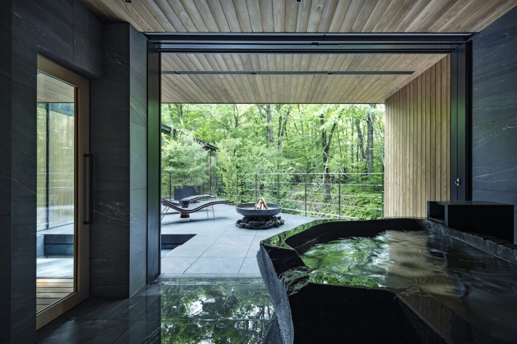 『NOT A HOTEL KITAKARUIZAWA IRORI』는 특별한 목욕 체험을 제공합니다. 거대한 바위를 깎아 만든 바위탕은 천연 온천수를 사용해 몸과 마음을 풀어줍니다. 이 반노천탕은 야외 테라스와 연결되어 있으며, 유리로 된 사우나에서도 숲의 경관을 즐길 수 있습니다. 사우나 후에는 온도 조절이 가능한 냉탕에서 상쾌한 시간을 보낼 수 있으며, 테라스에서 외기를 즐기며 여유로운 시간을 보낼 수 있습니다. 이 모든 요소는 하루의 피로를 풀어주는 특별한 경험을 선사합니다.