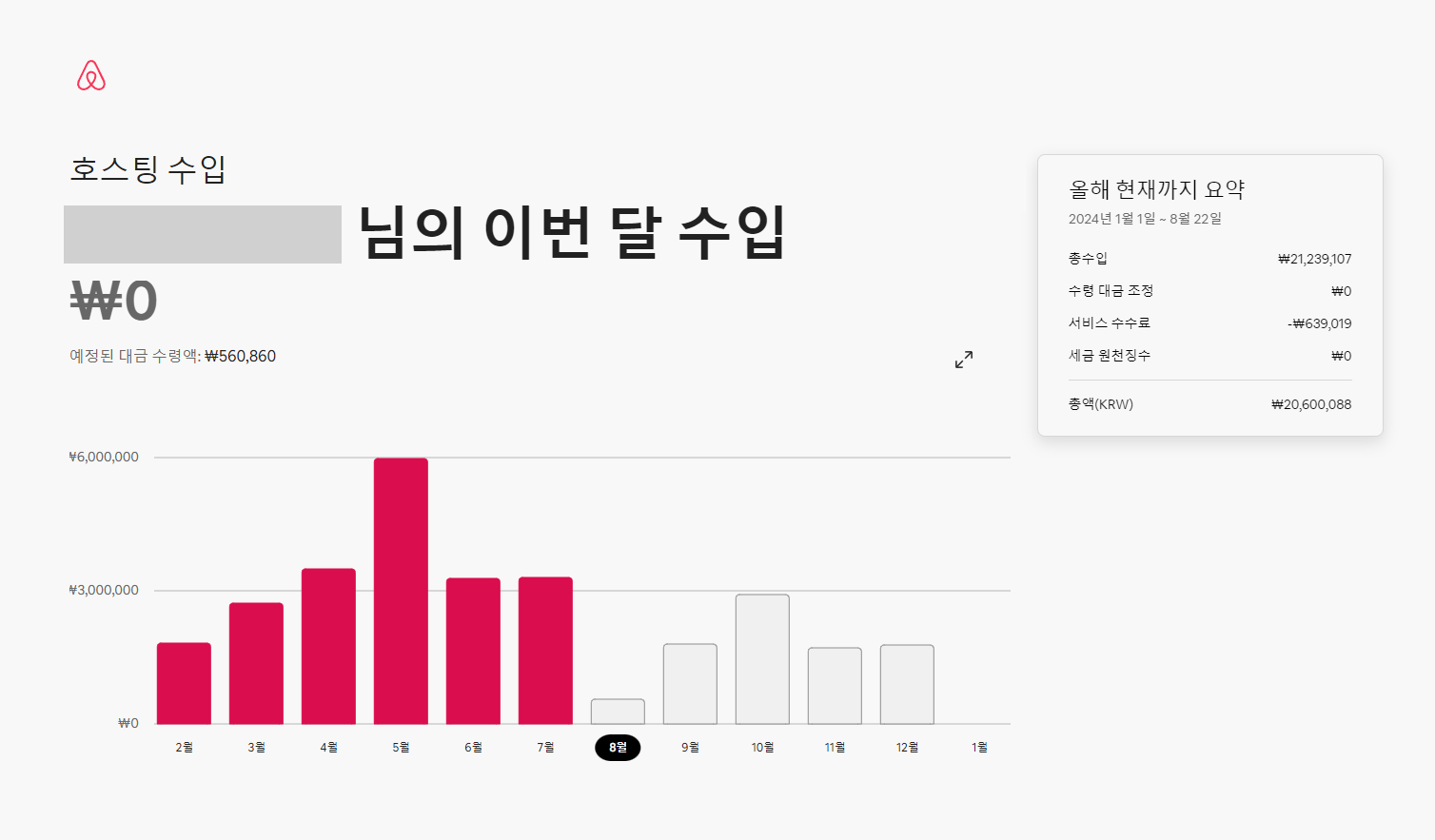 에어비앤비 운영이 6개월을 넘어간다. 그동안 45명의 게스트가 방문했고 20,600,088원의 대금을 수령 받았다. 어메니티 및 청소, 빨래비용 등의 관리비용을 빼진 않은 금액으로 순수익은 아니며, 애초 목표하였던 월 4250,000원 수익 X 6개월 = 25,500,000원에 80% 에 그치는 수익이다. 그래도 경기침체 국면에 첫 시작 6개월의 수익 치곤 나쁘지 않으며 앞으로 수익성 개선에 노력해 나갈 계획이다. 무엇보다 돈으로 수치화할 수 없는, 서울을 방문한 전 세계 여행자들과의 교류는 필자의 감성적 충족과 라이프스타일에 많은 영감을 주고 있다.