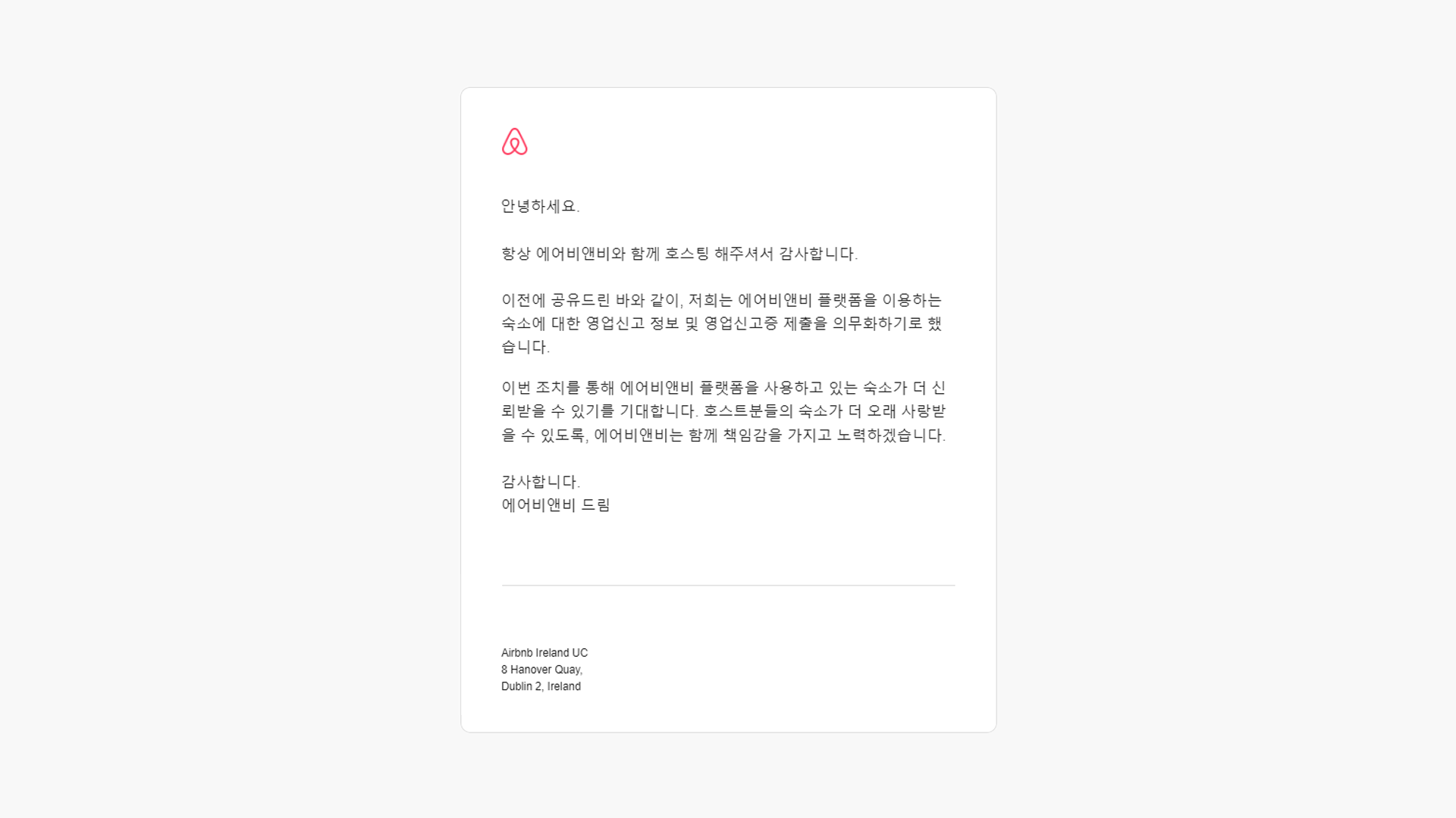 에어비앤비 '영업신고 의무화에 관한 상세한 안내' 메일 전문을 옮기고 필자의 생각을 덧붙인다.