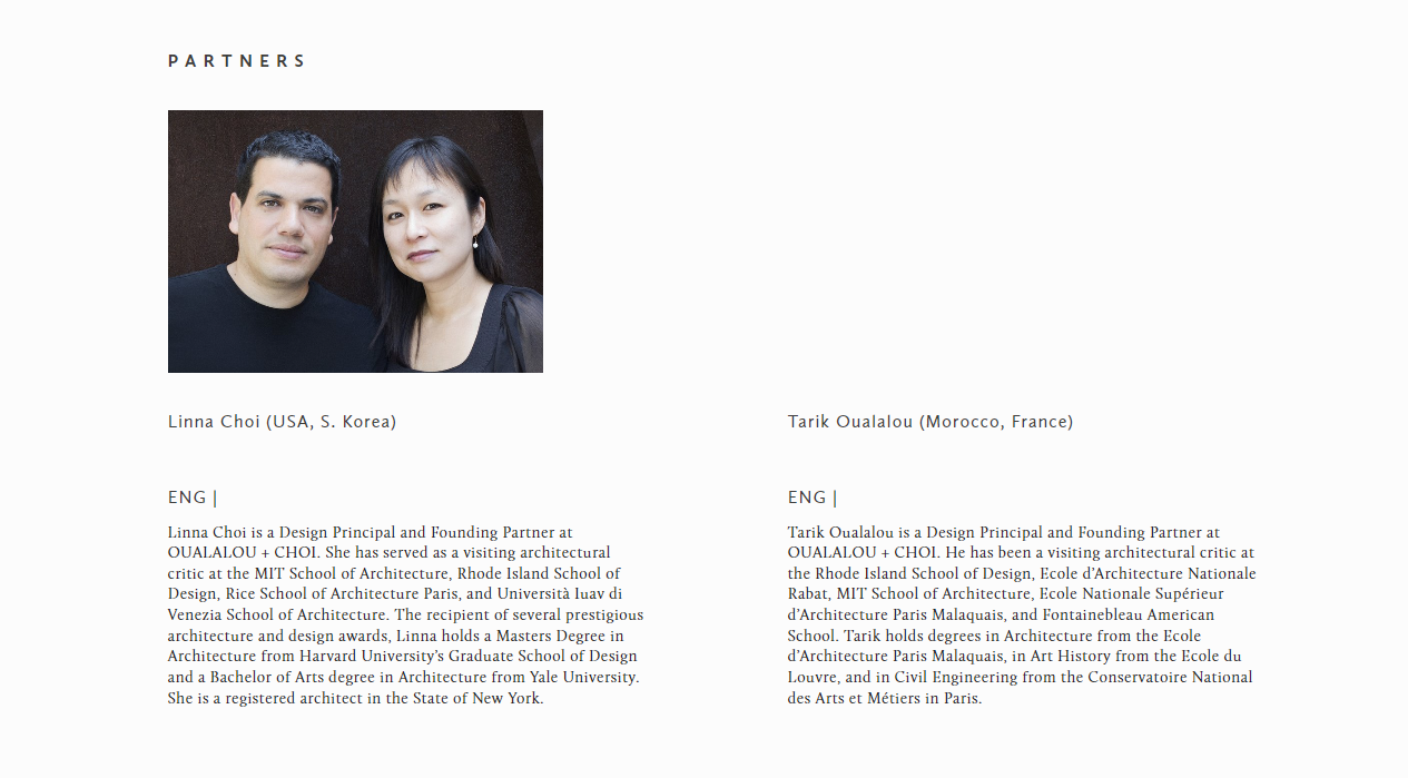 최리나는 우알랄루+최(OUALALOU + CHOI)의 디자인 수석이자 창립 파트너입니다. 그녀는 하버드 대학교 디자인대학원에서 건축학 석사 학위를, 예일 대학교에서 건축학 학사 학위를 받았습니다. MIT 건축학교, 로드아일랜드 디자인학교 등 여러 기관에서 방문 건축 비평가로 활동했습니다. 여러 권위 있는 건축 및 디자인 상을 수상한 그녀는 뛰어난 경력을 자랑합니다. 또한, 뉴욕주에 등록된 건축사로 활동하고 있습니다. (편집자 추가, 건축가 홈페이지 링크)