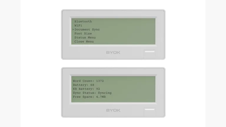BYOK는 간단한 LCD 화면을 갖추고 있으며, 이 화면은 최대 6줄의 텍스트를 표시할 수 있습니다. 사용자는 블루투스 또는 USB-C를 통해 자신의 선호하는 키보드를 연결해 사용할 수 있습니다. 화면 크기는 약 7.22인치로 가로 16.5cm, 세로 8cm, 두께는 1.4cm입니다. 매우 휴대성이 뛰어나고 가벼워 어디서든 글을 작성할 수 있습니다. 이 장치는 인터넷 연결 없이 작동하며, 배터리 수명은 최대 20시간까지 지속됩니다. 이는 외부 방해 요소를 차단하고, 글쓰기에만 집중할 수 있는 환경을 제공합니다.