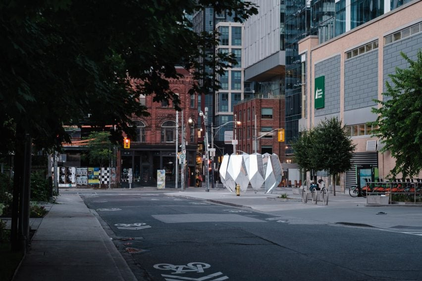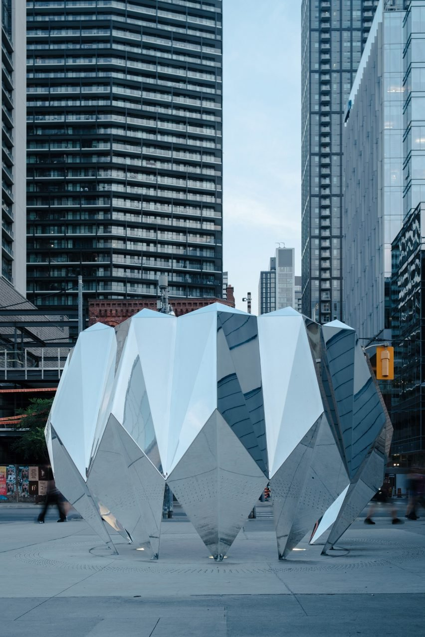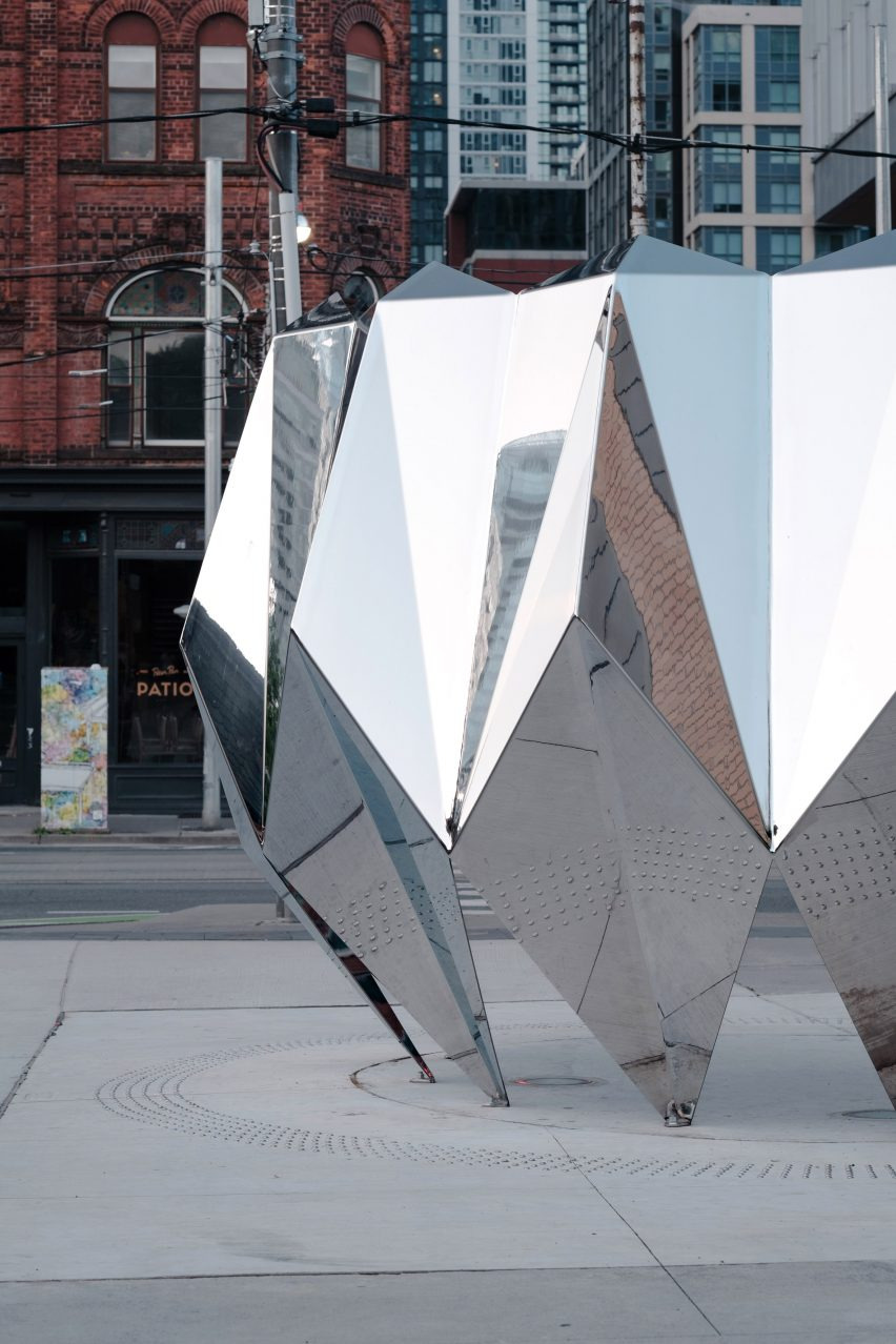 현지 디자이너 지흘링 리(Jyhling Lee)는 토론토 도심의 "아이코닉"한 거리인 퀸 스트리트 웨스트(Queen Street West)에 종이접기에서 영감을 받은 스테인리스 스틸 조형물을 설치했습니다. 이 조형물은 "리플렉터(Reflector)"라는 이름을 가지고 있으며, 대략 5미터 너비에 3미터 높이로, 거울처럼 반사되는 스테인리스 스틸로 제작되었습니다. 이 작품은 퀸 스트리트 웨스트의 한 모퉁이에 위치하고 있으며, 도심의 활기찬 에너지를 반영하는 공공 예술작품으로 디자인되었습니다.