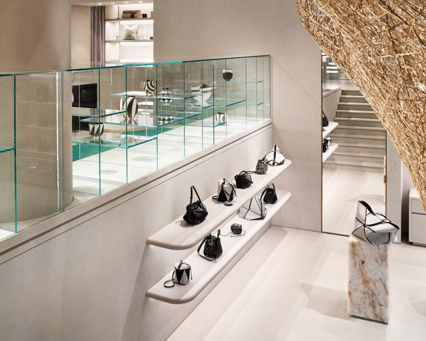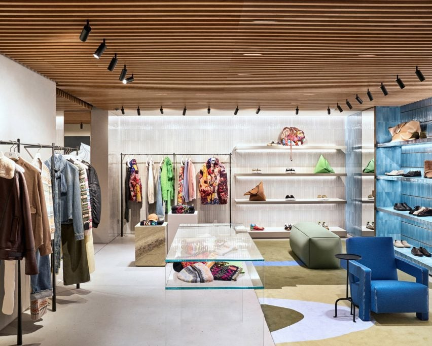 매장 내부는 세 층으로 구성되어 있으며, 갈색, 초록색, 파란색 타일이 곳곳에 사용되었습니다. 이 타일들은 의류, 가방, 신발 등을 전시하는 블록 형태의 받침대와 선반을 장식합니다. 로에베는 매장 곳곳에 예술 작품을 배치해, 19세기 가죽 공예 집단으로 출발한 브랜드의 기원을 상기시키고, 매년 진행되는 공예상을 언급했습니다.