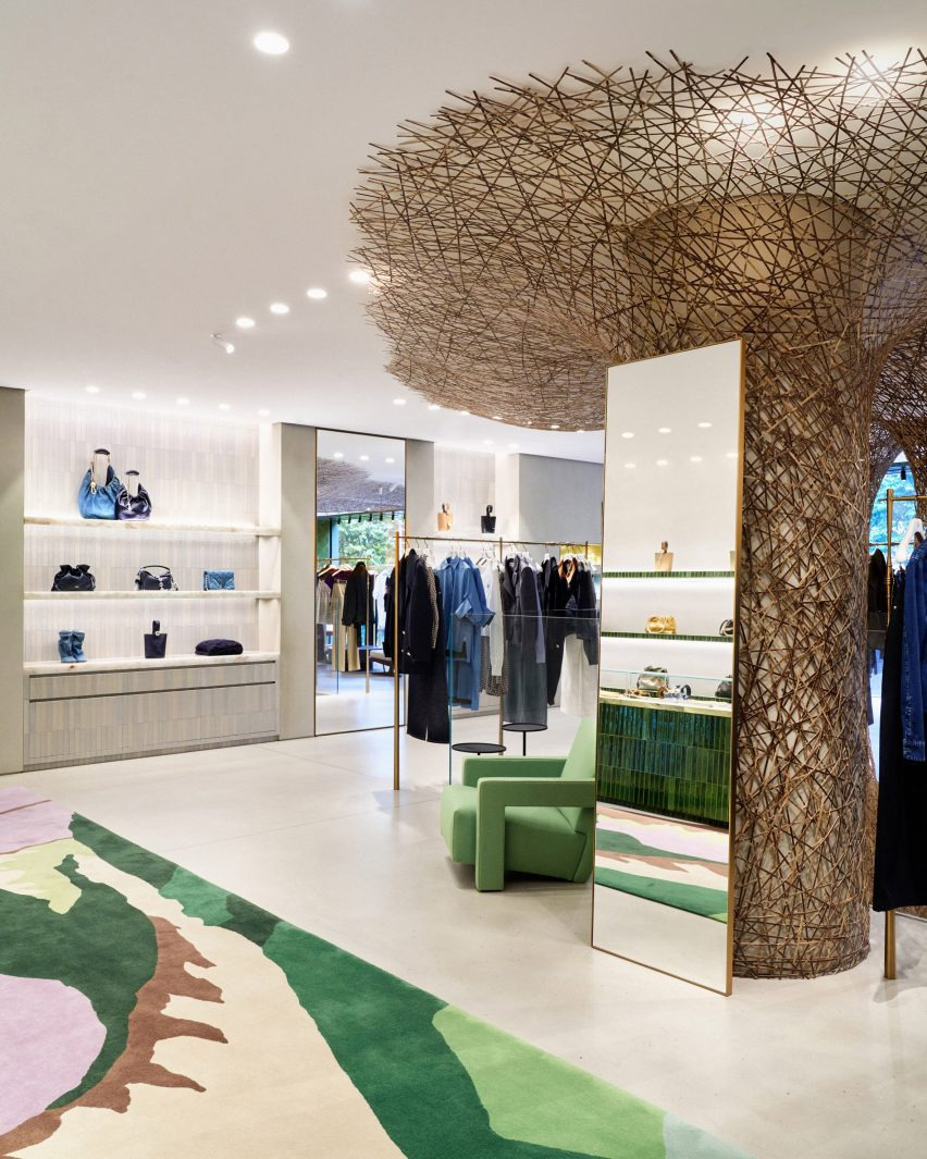 로에베는 매장을 '패션, 예술, 공예, 디자인 가구가 어우러진 공간'으로 구상했으며, 맞춤형 펠트, 블랙 월넛, 캔버스 등 다양한 소재로 마감된 가구들이 배치되어 있습니다. 신발을 신어볼 수 있는 맞춤형 로에베 가죽 벤치가 마련되어 있으며, 블랙 테라조와 불에 그을린 목재로 제작된 테이블과 단상도 매장에 설치되었습니다. 영국 섬유 예술가 존 앨런(John Allen)의 태피스트리를 추상적으로 해석한 양모 카펫도 인테리어의 일부로 활용되었습니다.