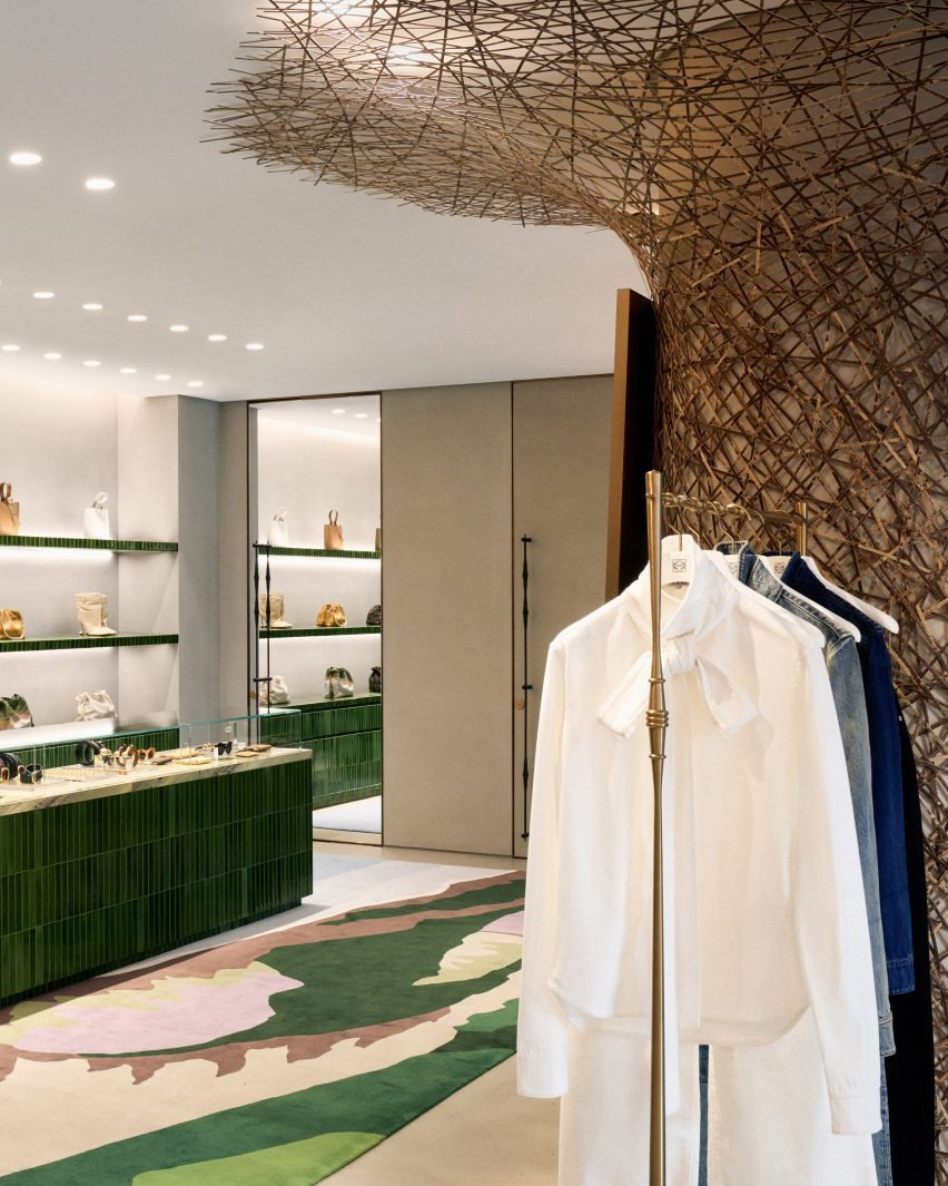 매장의 외관은 스페인에서 제작된 수제 타일로 덮여 있으며, 강렬한 초록색의 단일체로 이루어진 파사드가 눈길을 끕니다. 이 타일들은 매장의 도심 환경과 주변 녹지와의 대화를 이루기 위해 디자인되었으며, 로에베는 이를 통해 매장의 독창적인 미학을 강조했습니다. 타일의 질감과 색감은 로에베가 지닌 전통과 현대성을 모두 반영하고 있습니다.