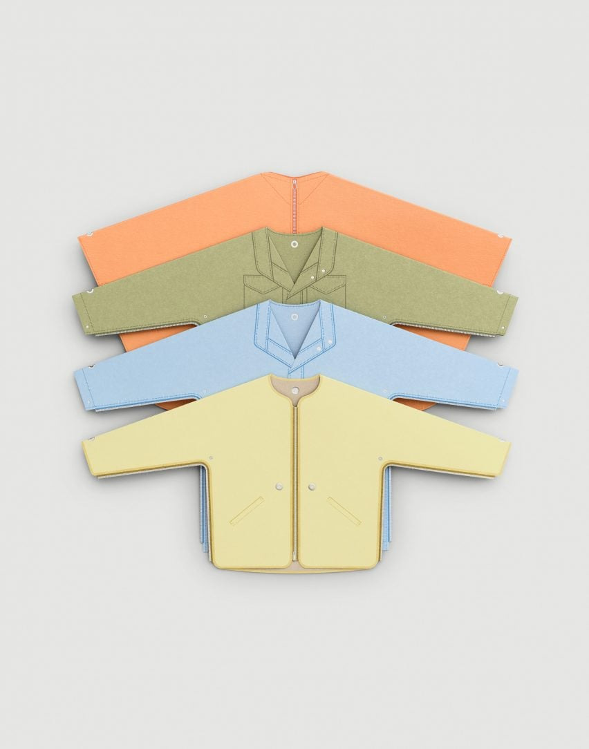 이 컬렉션의 중심은 노란색과 오프 화이트 색상으로 구성된 심플한 재킷입니다. 이 재킷에 아이브가 디자인한 자석 듀오(Duo) 버튼을 사용해 세 가지의 다른 외부 레이어를 추가할 수 있습니다. 필드 재킷, 파카, 또는 판초 중 하나를 선택하여 기본 재킷에 결합해 사용자가 원하는 스타일로 맞춤형 레이어링이 가능합니다. 이 자석 버튼은 알루미늄, 황동, 강철, 고급 열 저항 자석으로 만들어졌으며, 버튼 표면에는 두 브랜드의 로고가 새겨져 있습니다.