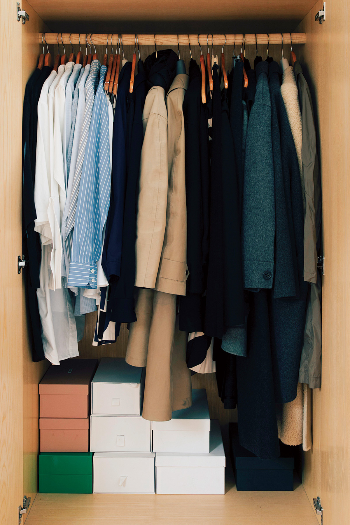 셔츠와 데님은 흰색과 파란색으로, 심플한 옷장으로 충분합니다. "서랍에는 티셔츠나 니트가 들어있어서 여기에 있는 옷만 있는 것은 아니지만, 제 정책은 한 개를 구매하면 한 개를 처분하는 것입니다. 다만, 낡은 것들은 여름 별장에서 입고 있어서 처분이라고 보기는 어려울지도 모르겠습니다. 여기 있는 것 중 입지 않는 아이템은 하나도 없고, 최근에 구입한 것은 없으며, 대부분은 몇 년에서 10년 가까이 애용하고 있습니다. 제게 있어서 치프 시크란, 비싼 것일지라도 트렌드에 흔들리지 않는 실루엣과 적당한 볼륨감, 그리고 좋은 원단이 사용되어 오래 사용할 수 있는 품질 좋은 것을 선택하는 것입니다. 착용할 수 있는 연수로 환산하면 결국 저렴하게 나옵니다."