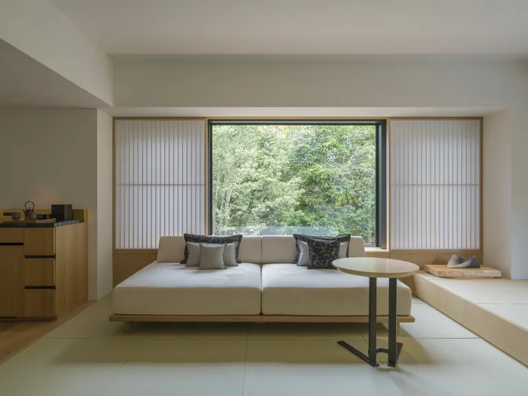 호텔 내부는 간결하고 현대적인 미학과 전통 일본식 디자인이 조화를 이룹니다. 객실은 타타미 바닥과 창가의 낮은 플랫폼, 그리고 도코노마에 놓인 세라믹 아티스트 시부야 에이치의 작품 등으로 꾸며졌습니다. 또한, 금박으로 장식된 천장과 부드럽게 나누어진 미닫이문, 일본식 히바 나무로 만든 욕조가 특징이며, 일부 객실에서는 도시의 아름다운 전망을 감상할 수 있습니다. 이러한 디테일들은 호텔에 머무는 동안 전통과 현대의 편안함을 동시에 느끼게 합니다.