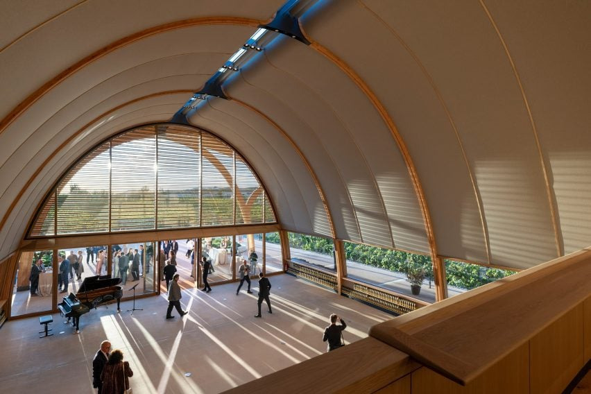 포스터 + 파트너스의 방문 센터는 50미터 길이, 25미터 너비, 그리고 최고 10미터의 높이를 가진 배럴 아치형 구조입니다. 이 디자인은 와이너리의 산업적 역사를 반영하며, 기둥 없는 내부 공간을 제공하여 개방적이고 유연한 공간으로 사용됩니다. 스튜디오는 "아치형 지붕은 와이너리의 산업 유산에서 영감을 받아 목재 아치로 만들어진 경량 구조로 재해석되었습니다"라고 밝혔습니다. 방문 센터는 포도밭 입구로부터 구불구불한 길을 따라 접근할 수 있으며, 새로운 소셜 중심으로서의 역할을 기대하고 있습니다. 또한 이 구조는 외부 환경과의 조화를 이루도록 설계되었습니다.