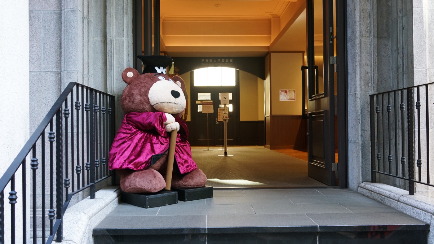 창립자 오쿠마 시게노부와 발음의 유사성 때문에 마스코트로 지정된 곰, 와세다베어가 입구를 지키고 있다.