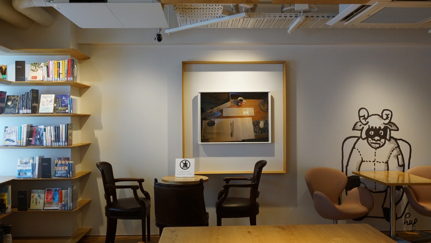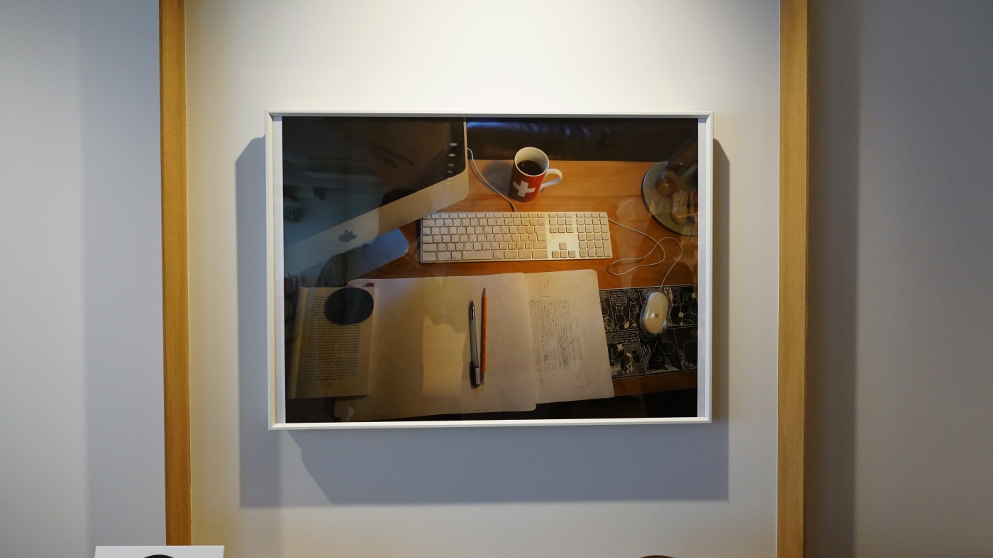 열람실 한편에 액자 걸린 사진은 무라카미 하루키가 직접 찍은 것으로 알고 있는 예전 작업실 데스크 사진이다.