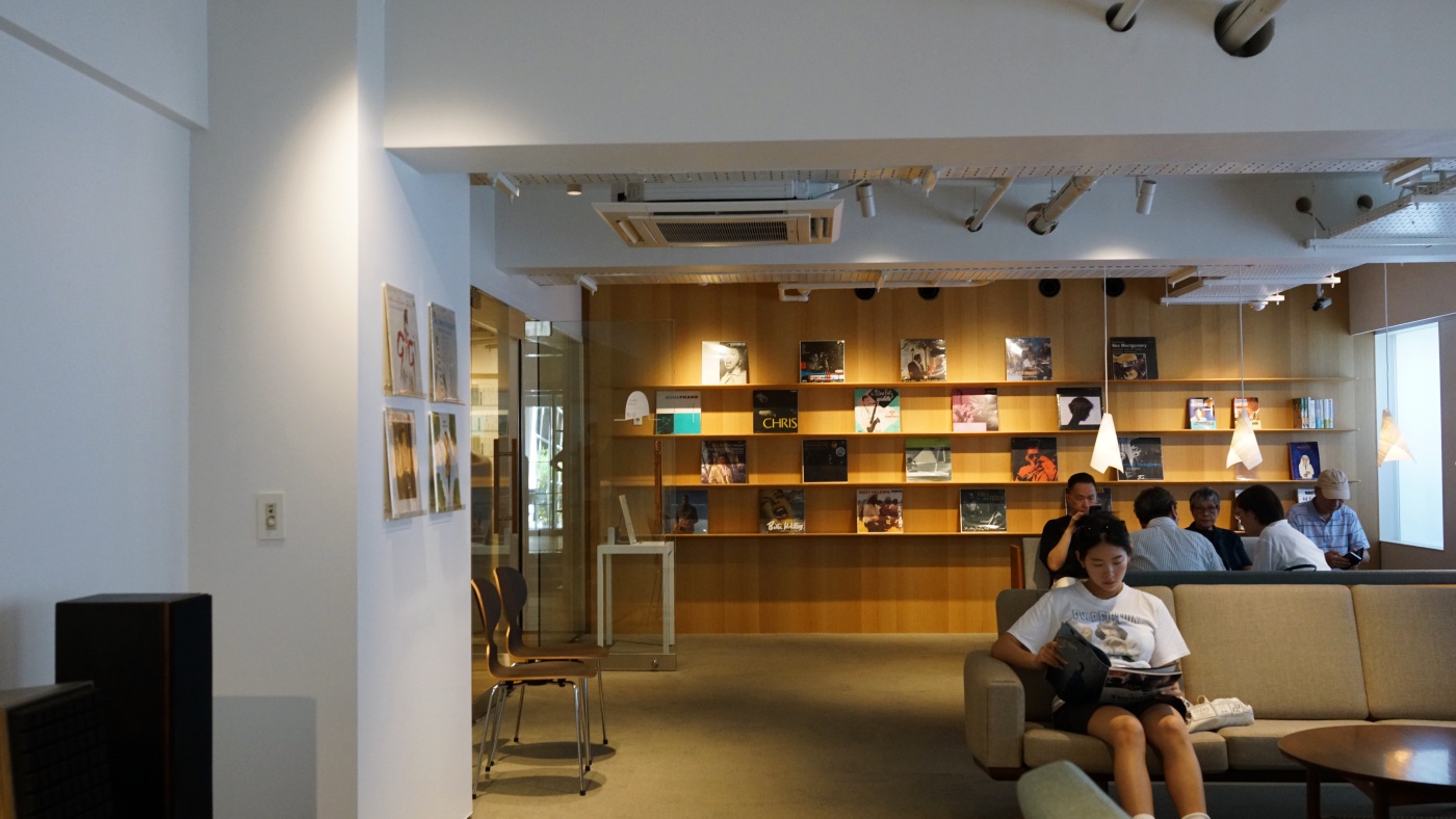청음실 내부의 모습. 편안한 라운지 소파와 카펫 바닥 그리고 멀리 목재 선반에 무라카미 하루키가 기증한 LP 바이닐레코드가 진열되어 있다.