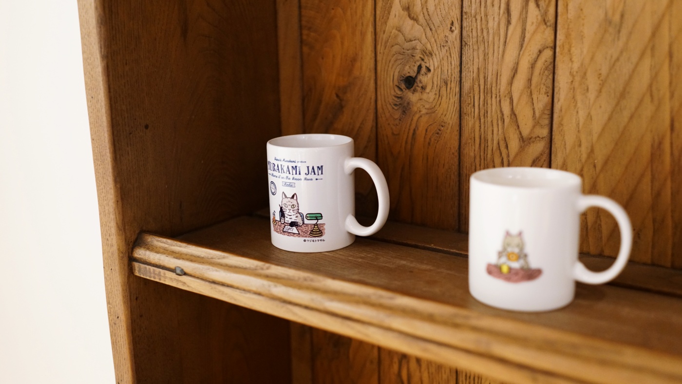 기증된 목재 캐비넷에 전시된 무라카미하루키 라디오 굿즈 머크겁.