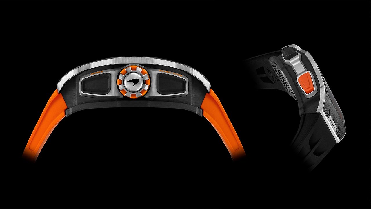 이 시계의 케이스 디자인은 맥라렌 W1의 매력적인 실루엣을 반영하고 있습니다. 케이스는 탄소 섬유와 0.5mm 두께의 티타늄이 결합되어 만들어졌습니다. 이 조합은 시계의 내구성을 높이며, 맥라렌의 고급스러운 이미지에 부합하는 구조입니다. 리차드 밀은 이 시계에 사용된 카본이 현재까지 가장 진보된 형태라고 설명합니다. 맥라렌의 경량화 전략과 일맥상통하는 요소로, 모든 부품이 경량화된 하이퍼카에 잘 어울립니다.