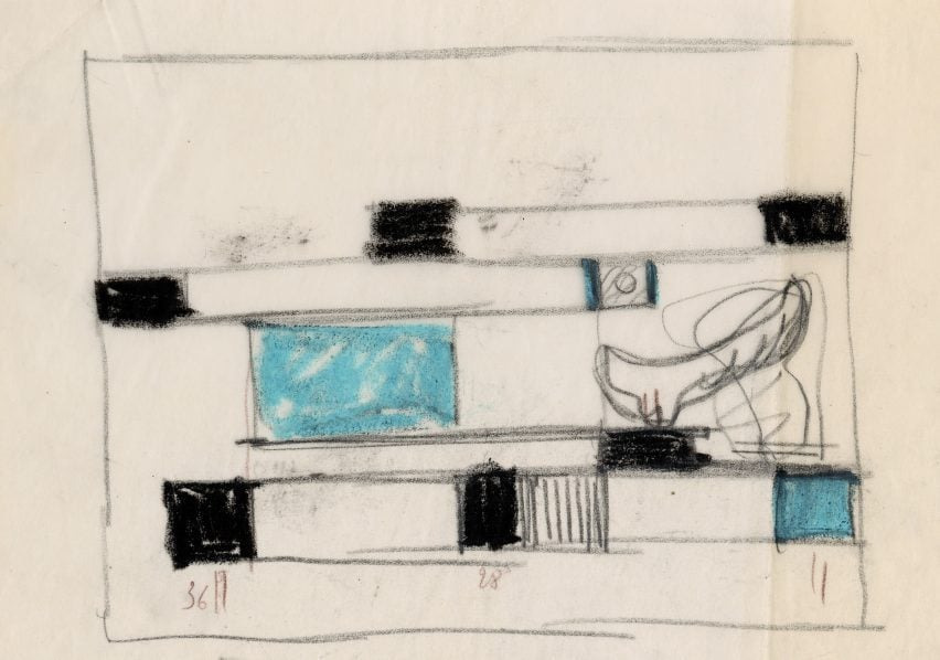 1950년대 초, 페리앙은 일본에서 생활하며 현지의 전통적인 수키야 양식(Sukiya-style) 가구에서 영감을 받아 그녀의 서가 디자인을 발전시켰습니다. 특히 교토의 17세기 궁정 가옥에서 발견한 구름 모양의 선반 배열은 그녀의 ‘누아주(Nuage)’ 서가 디자인의 기초가 되었습니다. 이 디자인은 자유로운 형태의 알루미늄 연결 요소를 사용하여 공간을 리드미컬하게 구성하고, 그 위에 놓인 물건들을 돋보이게 했습니다. 이 서가는 공간 분리 기능을 수행하면서도 다양한 용도로 사용할 수 있도록 설계되었습니다.
