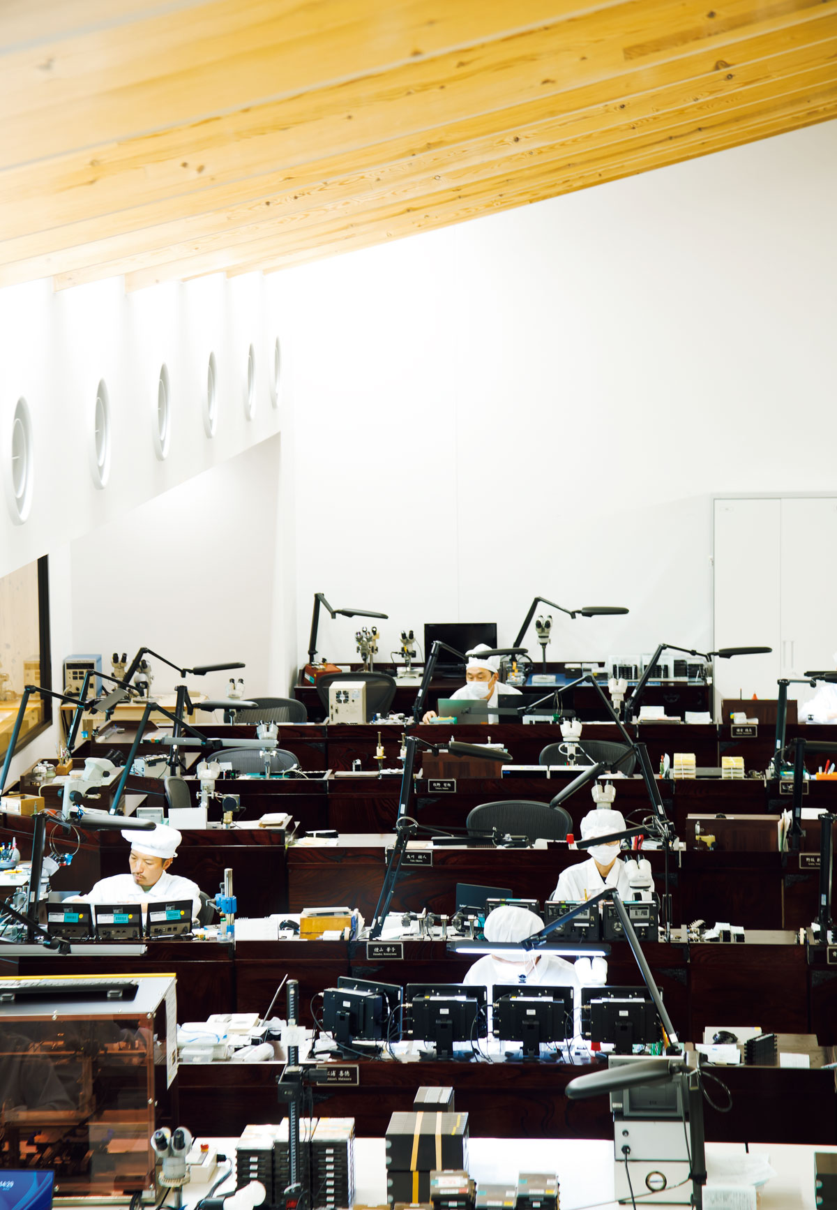 공방에서는 수십 명의 장인이 하루하루 기계식 시계의 무브먼트를 조립하고 조정하며 일에 몰두하고 있습니다. 이 공방은 전 세계적으로도 드문 목조 클린룸으로 이루어져 있으며, 공방 북쪽의 유리창을 통해 이와테산과 숲을 감상할 수 있는 자연 친화적인 환경입니다. 또한 이곳에서 사용되는 작업대는 현지 전통 기술인 이와야도 단스(岩谷堂簞笥)를 기반으로 제작되어, 일본의 전통적 가치를 담고 있습니다. 공방은 예약제로 운영되며 일반인도 이곳을 견학할 수 있습니다.