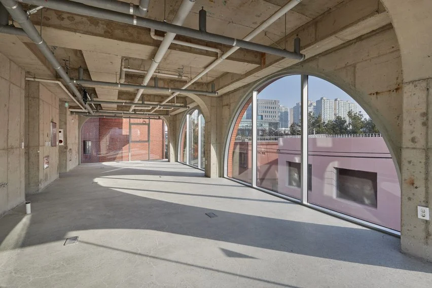 건물의 상단 세 개 층에는 아치형 디자인 패턴이 감싸고 있으며, 불규칙하게 배치된 직사각형 창문이 벽돌벽과 상호작용하며 아파트 내부의 다양한 공간을 프레임으로 둘러싸고 있습니다. 소수 아키텍츠는 “성수동의 다양한 복잡성을 단순화하여 과밀한 도시 풍경 속에서 비어 있는 공간을 만들고자 했다”고 밝혔습니다. 이어 “아치형 디자인은 건물에 개성을 부여하기 위해 조화롭게 배치되었다”고 설명했습니다.