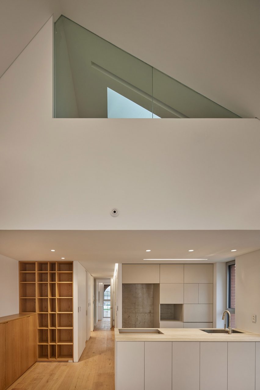 사무 공간의 구조물과 배관은 그대로 노출되어 있어 입주자들이 유연하게 사용할 수 있는 개방형 공간을 제공합니다. 아파트 내부 역시 미니멀리즘을 강조하여 흰색 벽, 나무 바닥, 감춰진 조명으로 간결하게 구성되어 있습니다. 소수 아키텍츠는 앞서 서울 목2동에서 텍스처가 살아있는 회색 벽돌로 마감된 다세대 주택 프로젝트를 완료한 바 있습니다.