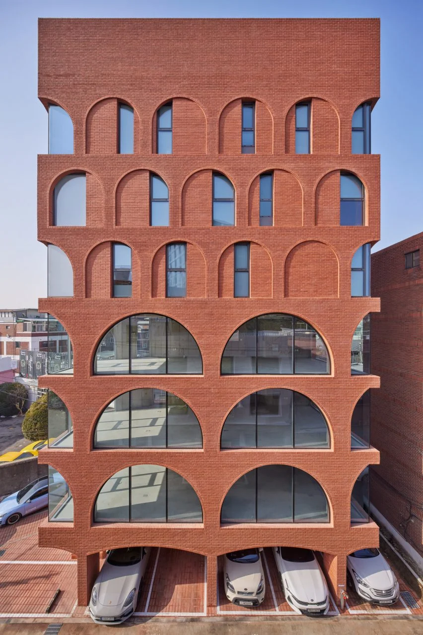 서울 성수동에 위치한 필로메 빌딩(Fillome Building)은 지역 스튜디오 소수 아키텍츠(Sosu Architects)가 설계한 복합용도 타워로, 빨간 벽돌 아치형 개구부가 외관을 생동감 있게 만들어줍니다. 이 건물은 세 개 층의 상업 공간과 세 개 층의 주거 공간을 결합하여 지하 주차 공간 위에 세워졌으며, 벽돌 필로티 구조로 구성되어 있습니다. 소수 아키텍츠는 성수동이 과거 공장과 창고 건물로 채워졌던 반산업 지역의 역사를 상기시키기 위해 이 지역의 상징적인 빨간 벽돌을 사용했습니다.