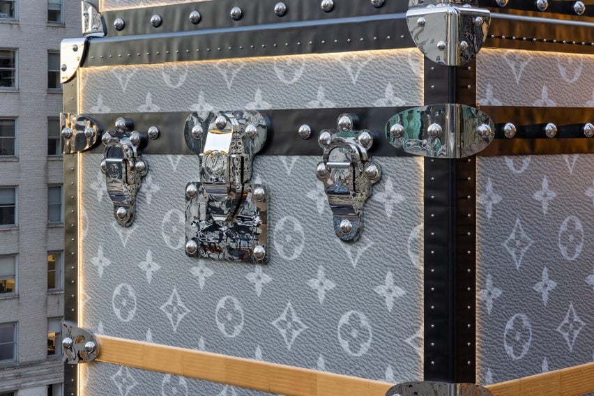 루이비통 내부 디자인 팀이 설계한 외관은 다양한 크기의 회색 트렁크 여섯 개가 쌓여 있는 형태를 띠고 있습니다. 이 디자인은 19세기부터 이어져 온 브랜드의 대표적인 Trianon Grey 캔버스를 기리기 위해 제작되었습니다. 외관에는 손잡이, 잠금장치, 리벳 등의 디테일이 포함되어 있으며, 일부 손잡이의 무게는 5,000파운드에 달합니다. 실제 루이비통 트렁크를 3D 스캔해 제작된 잠금장치와 레이저 컷 강철 코너 등이 사용되어 브랜드의 정교한 기술력을 보여줍니다.