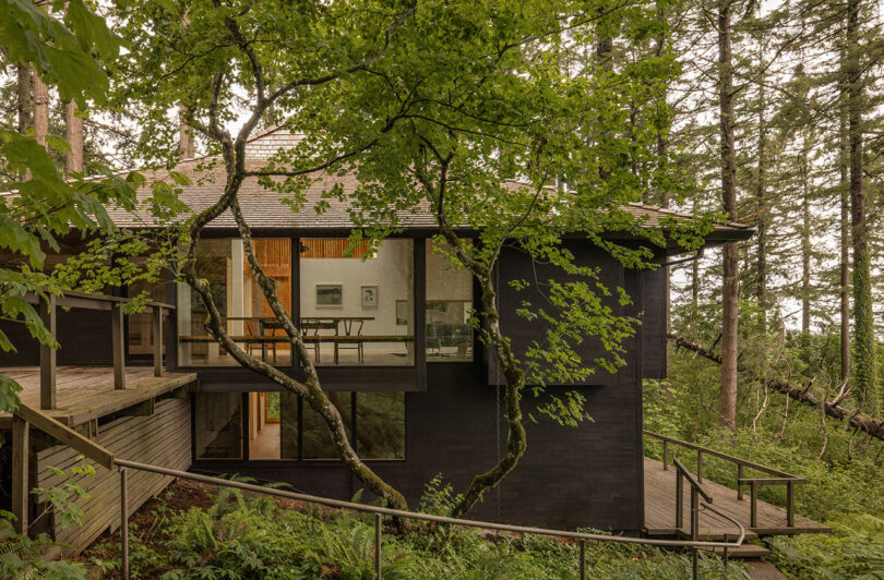 숲으로 둘러싸인 경사진 부지 위에 위치한 모리 하우스는 단정한 다크 우드 외관과 넓은 유리창, 그리고 주변 자연과 어우러진 데크가 특징입니다. 본 건물 외에도 분리된 차고와 스튜디오, 그리고 데크를 통해 접근 가능한 티 하우스 파빌리온이 포함되어 있습니다. SHED는 자이크의 초기 설계를 존중하면서도, 내부와 외부 공간의 흐름을 더욱 부드럽게 하여 일본식 미니멀리즘의 요소를 가미했습니다.