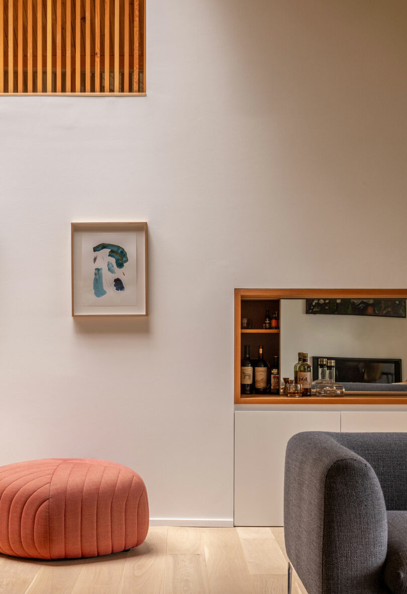 주방은 기능성과 장인 정신을 동시에 강조하며, 맞춤형 퍼(Fir) 소재와 창문을 활용해 주변 풍경과 연결감을 강화했습니다. 거실은 새롭게 배치된 벽난로를 중심으로 하여, 미니멀한 가구와 따뜻한 우드 톤으로 꾸며졌습니다. 주방과 거실은 실내외 경계를 흐릿하게 하며, 자연이 중심이 되는 생활 공간으로 재탄생했습니다.
