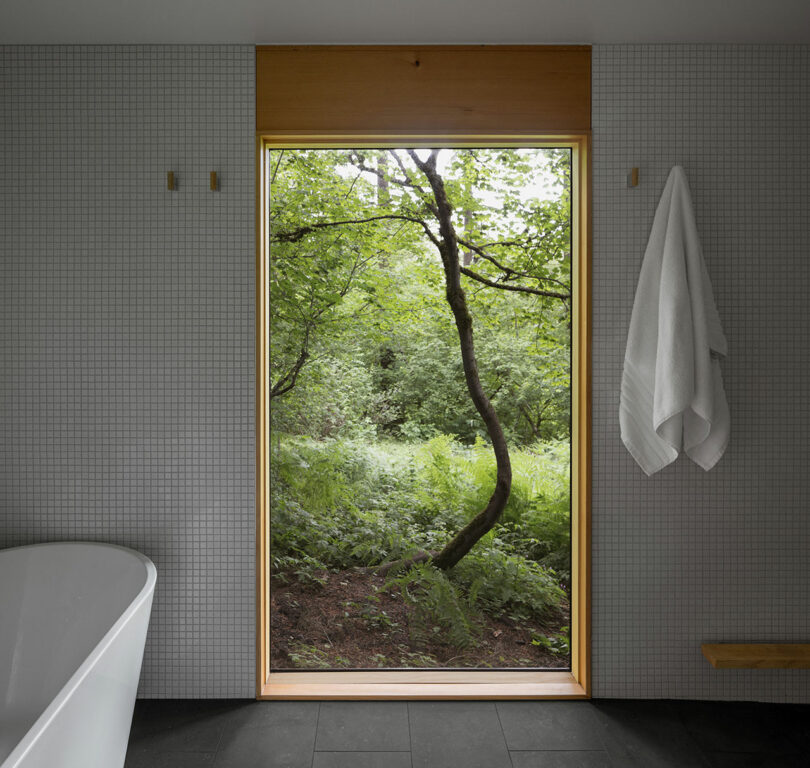 주방은 기능성과 장인 정신을 동시에 강조하며, 맞춤형 퍼(Fir) 소재와 창문을 활용해 주변 풍경과 연결감을 강화했습니다. 거실은 새롭게 배치된 벽난로를 중심으로 하여, 미니멀한 가구와 따뜻한 우드 톤으로 꾸며졌습니다. 주방과 거실은 실내외 경계를 흐릿하게 하며, 자연이 중심이 되는 생활 공간으로 재탄생했습니다.
