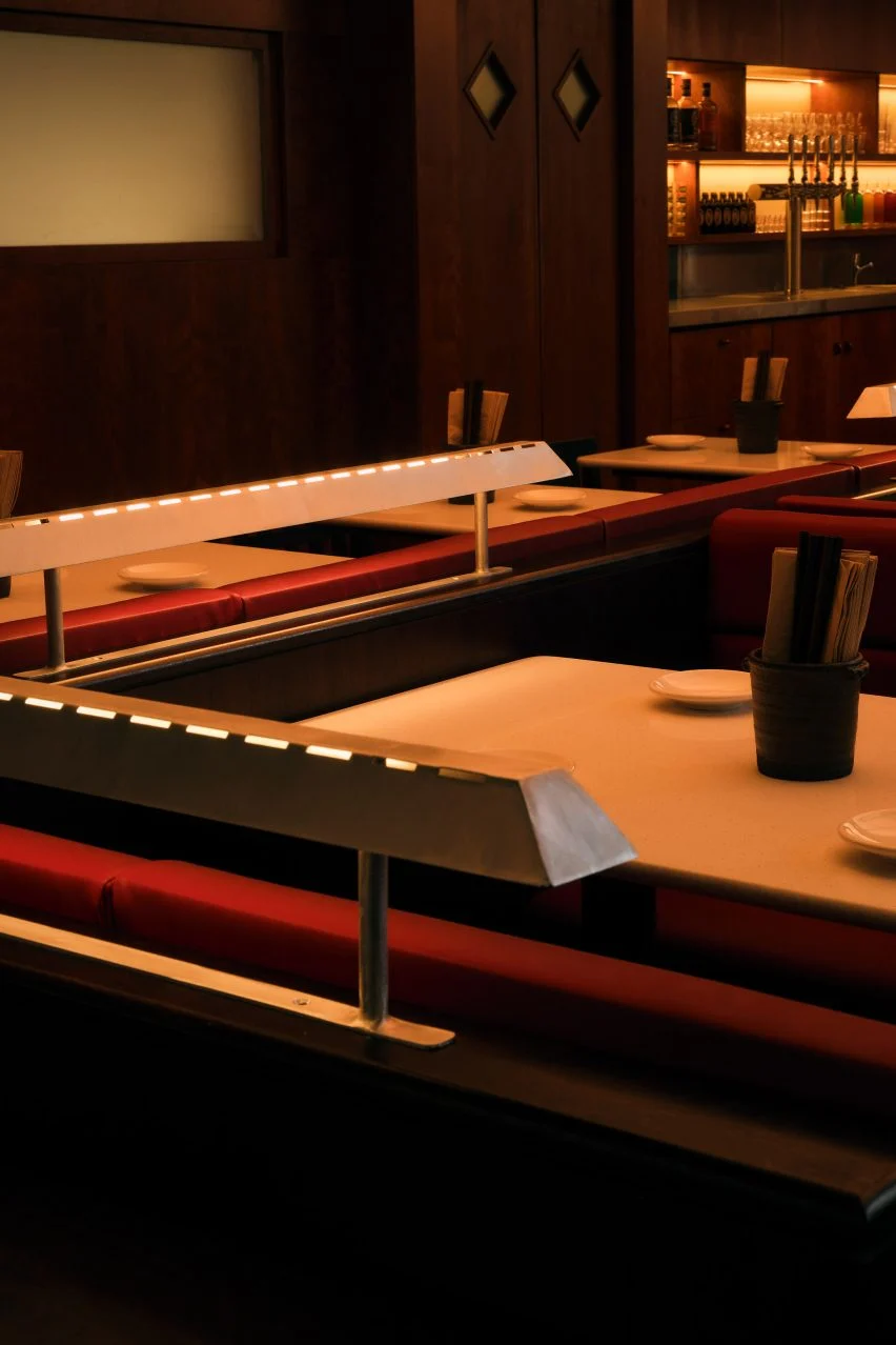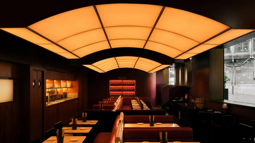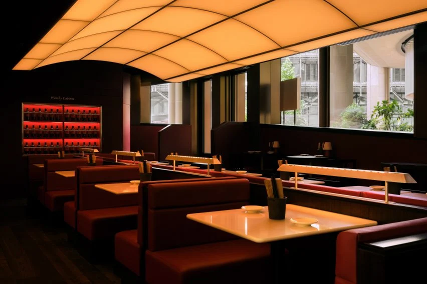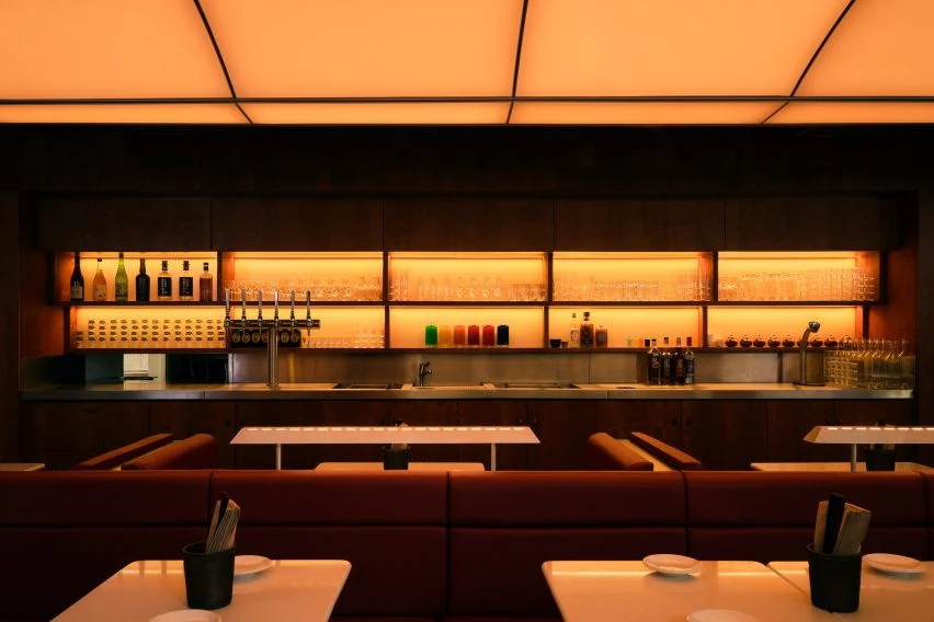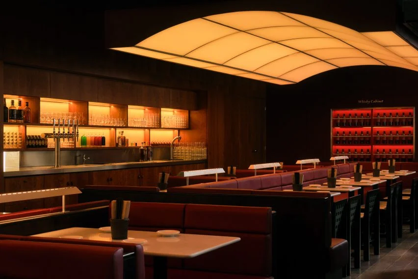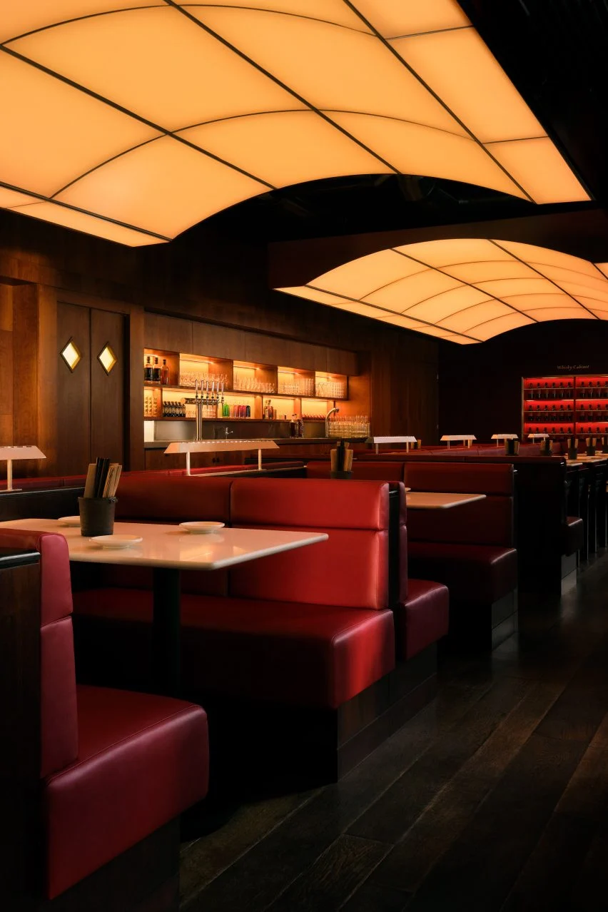 레스토랑 내부는 반짝이는 체리 우드와 어두운 월넛 우드가 조화를 이루며, 고급스러움과 편안함을 동시에 느낄 수 있도록 디자인되었습니다. 테이블 상판은 흰색 쿼츠로 제작되었으며, 높은 테이블은 검은색 래커드 오크로 마감되었습니다. 가구는 붉은색과 흰색 가죽으로 감싸져 있으며, 이러한 소재들은 공간의 따뜻한 분위기를 한층 더 강조합니다. 웡은 소재 선택에서 정밀함과 균형을 추구했으며, 이를 통해 과하지 않으면서도 세련된 공간을 완성했다고 설명했습니다.