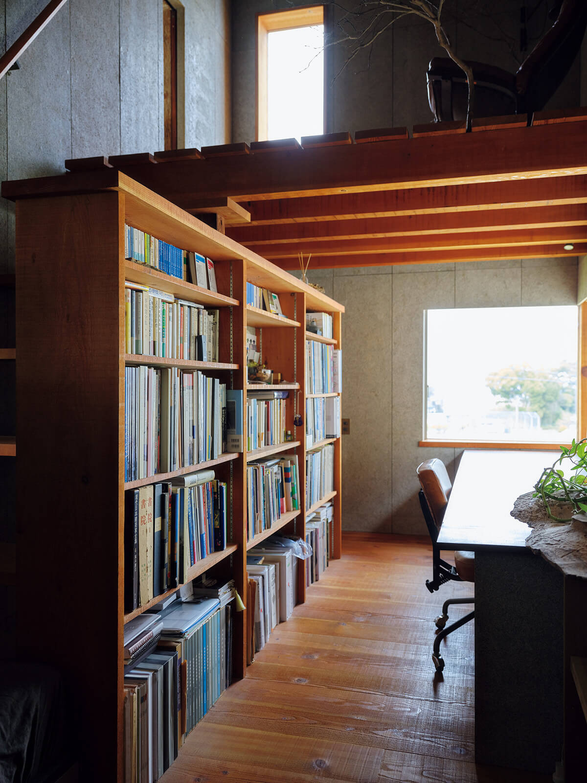 좌: 주방에서 야생 단풍나무 너머로 다이닝 공간을 바라본 풍경. 느티나무, 대들보,벽에 붙인 삼나무 껍질의 질감이 어우러져 쾌적한 분위기를 자아낸다. 우: 집의 거실 복층 천장 위쪽에 설치된 메자닌 공간은 지나치게 높은 공간감을 분절하는 효과를 준다. 이곳에 손으로 열 수 있는 창이 있어 통풍을 조절할 수 있다.