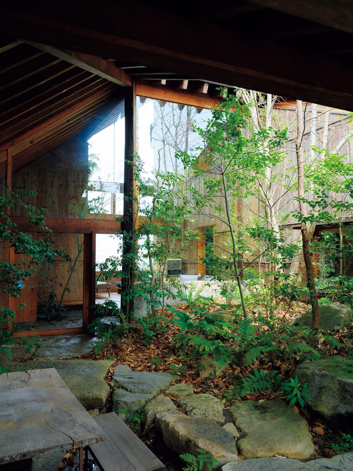 좌: 반외부 공간에서 바라본 집. 무라즈미야마에 자생하는 식물들로 조경되었다.