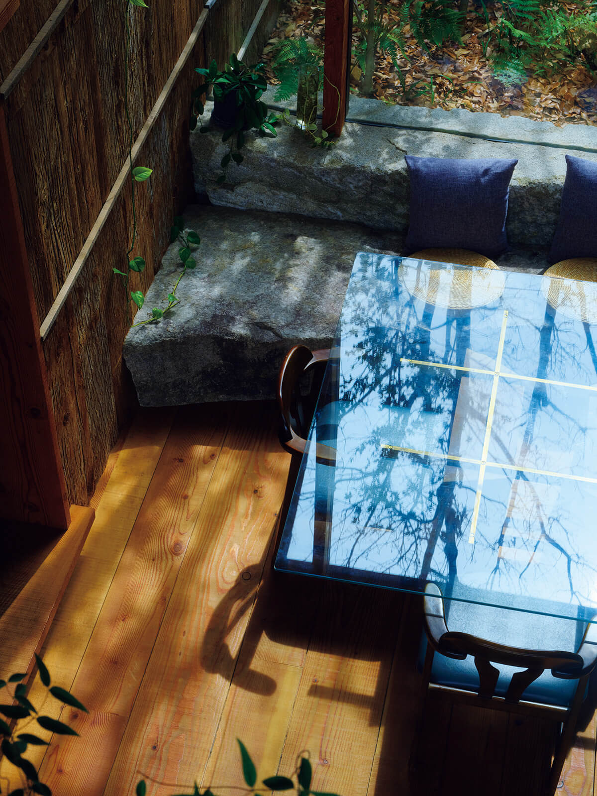 좌: 나오코 씨의 침실인 다다미 방은 다실처럼 밀폐된 공간이지만 앉은 시선 높이에 창문이 있어 비좁게 느껴지지 않는다. / 우: 집의 중정에는 산에서 채취한 자연석을 옮겼다. 이끼가 낀 상태 그대로, 아무런 가공 없이 놓였다. 비가 내리면 오목한 부분에 물이 고이고 새들이 그 물을 찾아 온다. 이 얼마나 호사스러운 장치인가!
