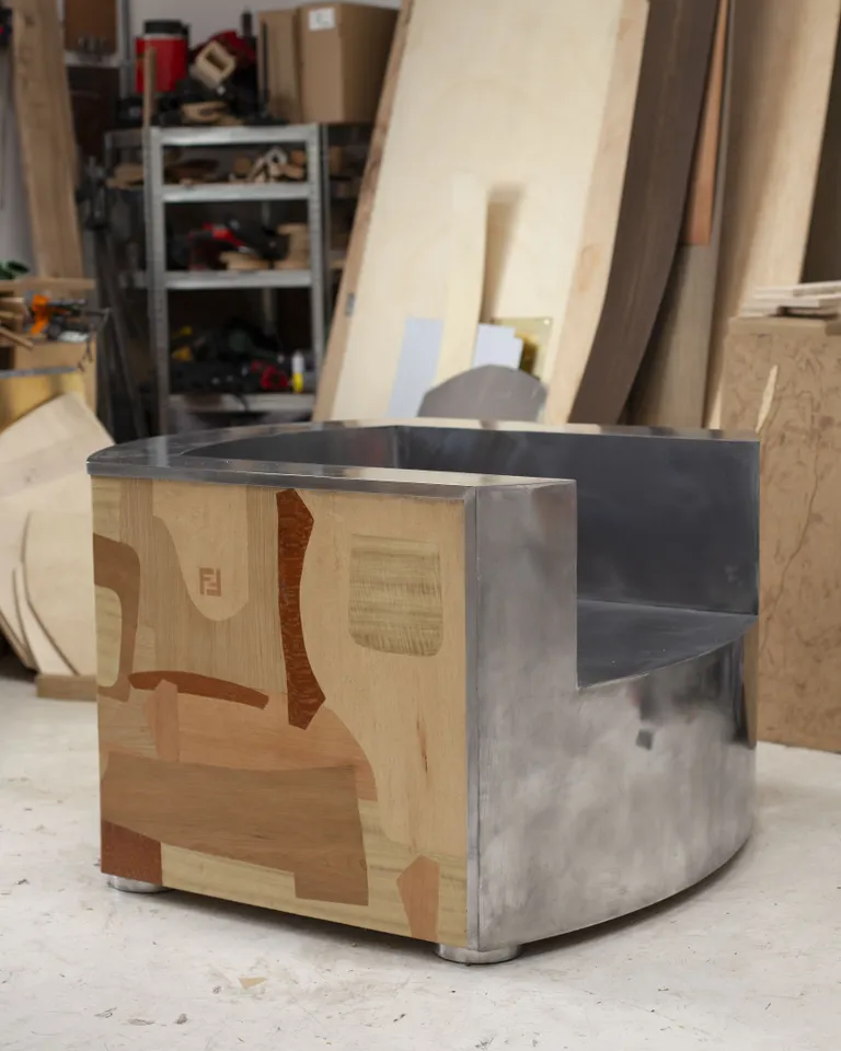 케메노는 로마를 방문하며 바티칸(Vatican)과 보르게세 미술관(Borghese Gallery)에서 받은 인상적인 경험을 통해 자신의 디자인 철학이 로마적 미감과 자연스럽게 어우러짐을 깨닫게 되었습니다. 그의 작품은 나무, 금속, 석재 등 다양한 재료를 유기적으로 활용하며, 이를 통해 장식적 요소가 아닌 본질적 형태에 집중합니다. 펜디의 과거 아카이브에서 찾은 나무와 가죽 패널 가방은 그에게 기존 자신이 탐구하던 영역과 펜디의 유산 사이의 교차점을 확인하는 기회가 되었습니다. 이 만남은 고전적 로마 조각의 구조적 특징을 현대적 감각으로 재해석하는 동시에, 전통과 현대, 장인 정신과 혁신을 조화롭게 이어냅니다. 케메노는 이를 통해 유기적 조형미와 역사적 맥락이 결합한 조화로운 예술 언어를 완성해나가고 있습니다.
