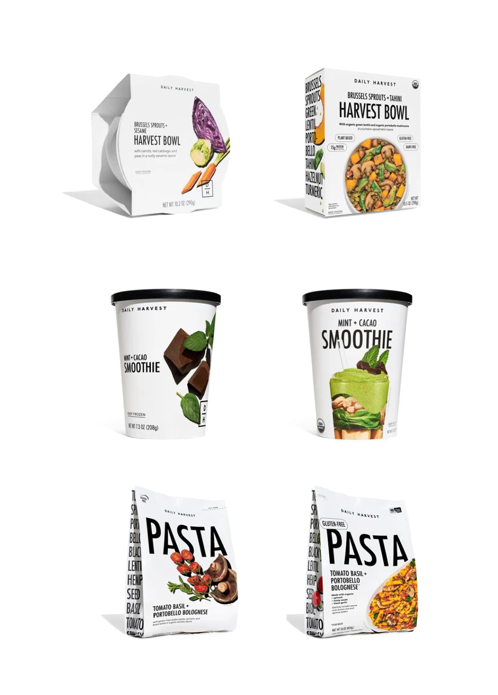 기존 데일리 하비스트 패키지는 잘려진 과일과 채소 등 원재료 이미지를 강조하는 방식이었습니다. 하지만 오프라인 매장에서 고객들은 단번에 제품이 완성된 형태를 보고 싶어 한다는 점이 확인됐습니다. 이에 따라 데일리 하비스트는 스무디, 즉석 식사, 파스타 등 완성된 제품 이미지를 패키지 전면에 배치했습니다. 재료 이미지는 패키지 옆면으로 옮겨, 자세한 정보를 확인하고 싶은 소비자를 위해 글과 함께 간략히 배치했습니다. 또, 용기 자체가 넘어지기 쉬웠던 기존 디자인에서 벗어나 간편하고 안정적으로 진열할 수 있는 상자로 변경했습니다.