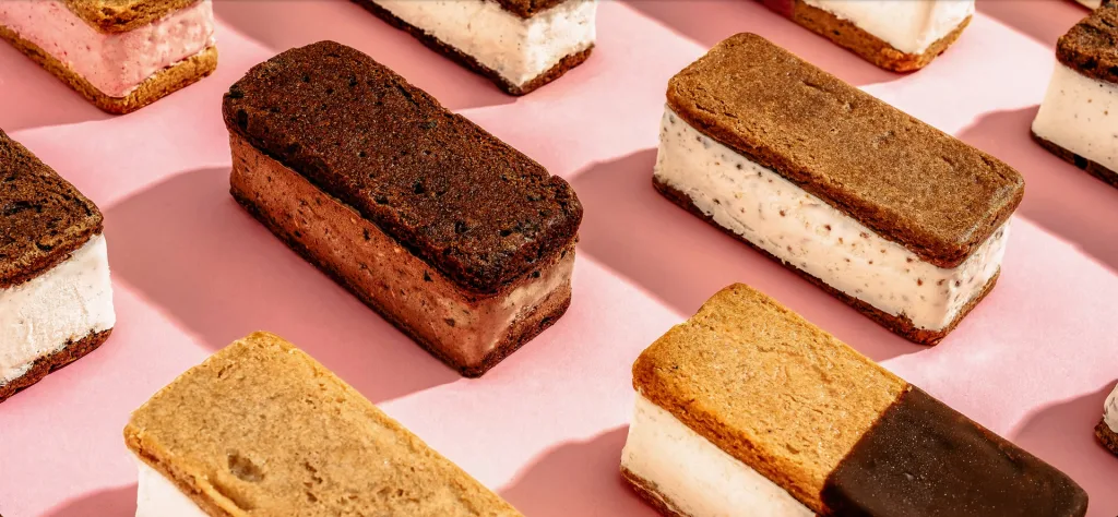 나이팅게일은 쿠키 몬스터(Cookie Monster), 초콜릿 블랙아웃(Chocolate Blackout), 바나나 푸딩(Banana Pudding) 등 다양한 맛을 선보이며 꾸준한 인기를 얻고 있습니다. 14%의 고품질 버터지방을 사용해 만든 진한 아이스크림과 직접 구운 브라우니나 쿠키를 활용해 식감과 풍미를 더욱 살립니다. 예를 들어 바나나 푸딩의 경우, 매장에서 바나나를 대량으로 숙성하고 직접 갈아 아이스크림에 섞어 넣는 과정을 거칩니다. 이러한 수공 방식은 대규모 생산 체계에서 드물지만, 브랜드의 품질 유지를 위해 포기하지 않고 있습니다. 이처럼 고급 재료와 정성을 담아 만들어진 제품은 프리미엄 아이스크림 샌드위치 시장에서 독보적인 위치를 차지하고 있습니다.