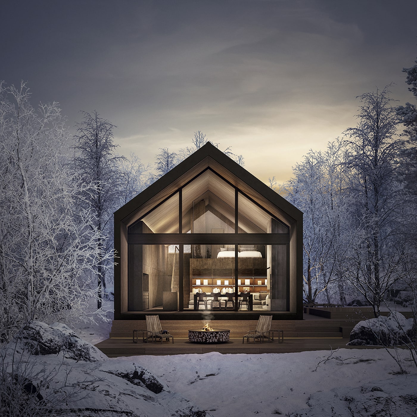 MODEL M은 가족 혹은 친구 5명이 함께 지낼 수 있도록 설계되었습니다. 두 개의 침실 외에 특별히 신경 쓴 부분은 두 개의 욕실입니다. 마스터 침실에는 샤워실과 화장실이 딸려 있고, 또 다른 욕실은 사우나가 포함된 대형 욕실로, 모두가 함께 즐길 수 있습니다. 그리고 모닥불 공간도 마련되어 있습니다.