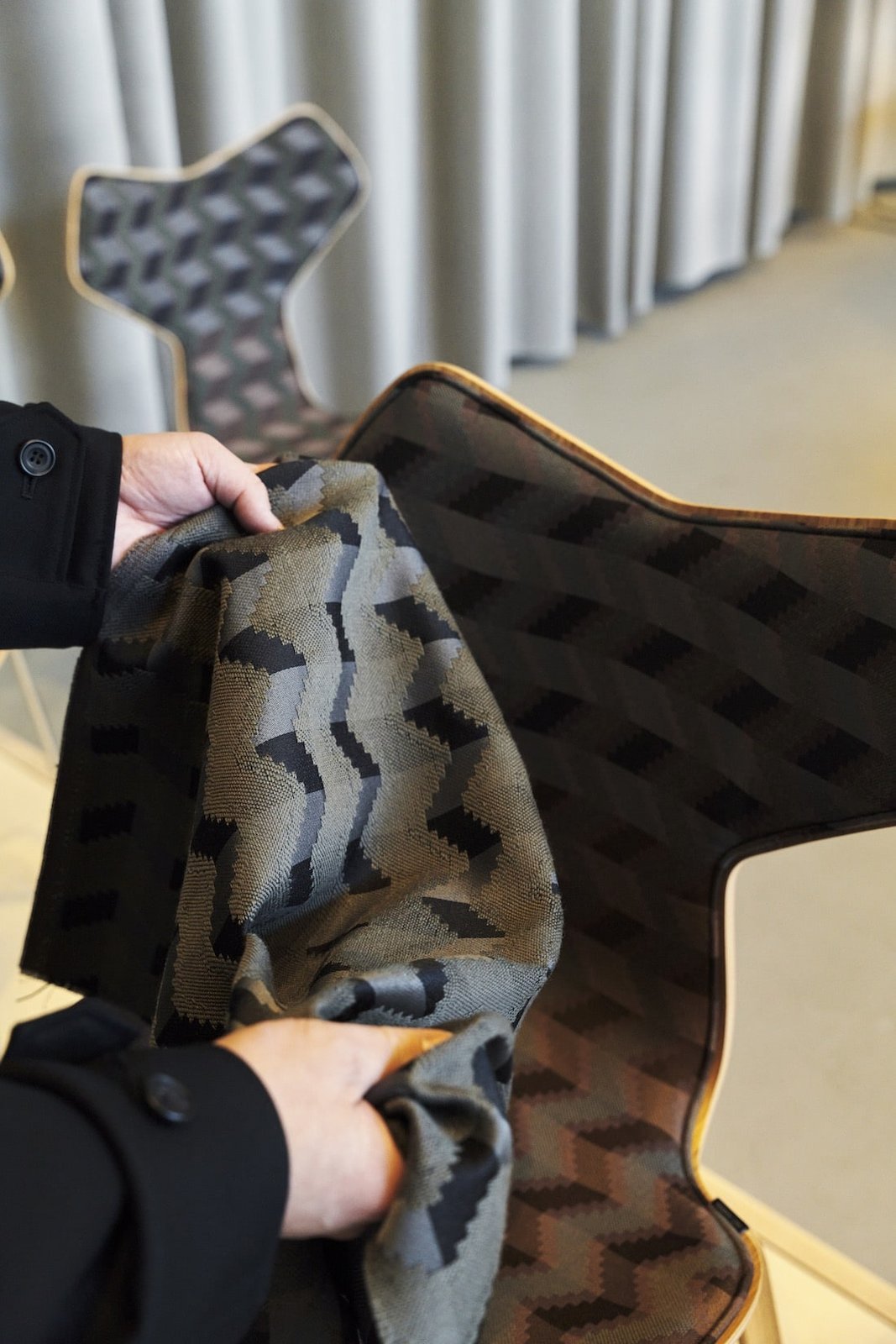 아이자와: 네. 아르네 야콥센의 그랑프리 체어는 평소에도 자주 사용하는데, 몸무게를 실었을 때 부드럽게 반발하는 감각이 정말 좋습니다. 이번에는 베이스의 삼각 지붕을 모티브로 한 커버를 프리츠 한센에서 제작해 주셨습니다. 슬리퍼나 모닥불용 앞치마, 스태프 유니폼 등도 제가 디자인했습니다.