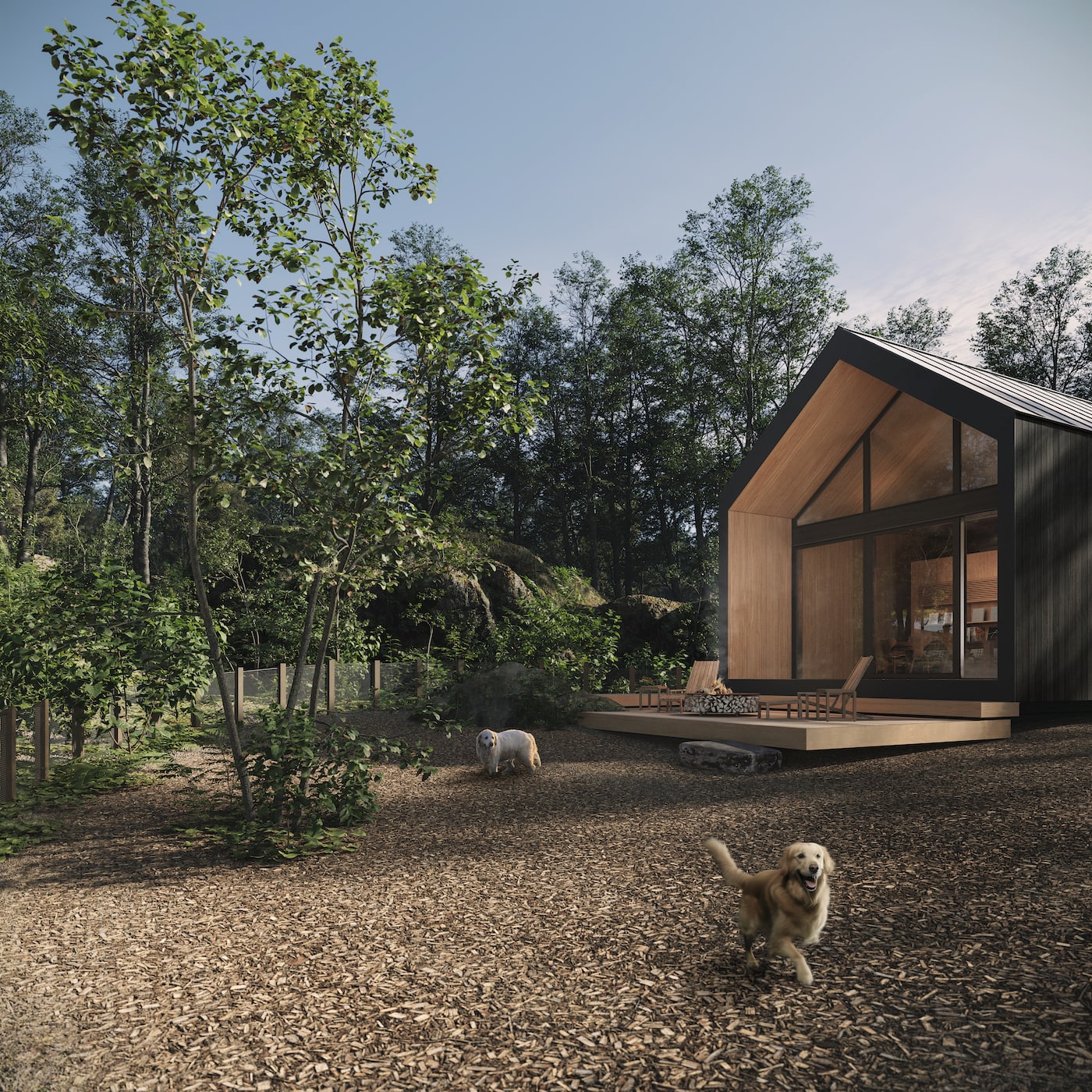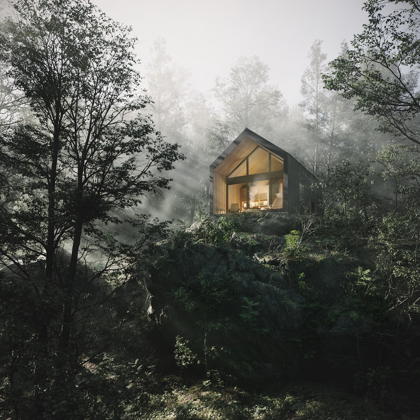 숲속에 점재하는 S, M, L 크기의 집으로 이루어진 빌리지