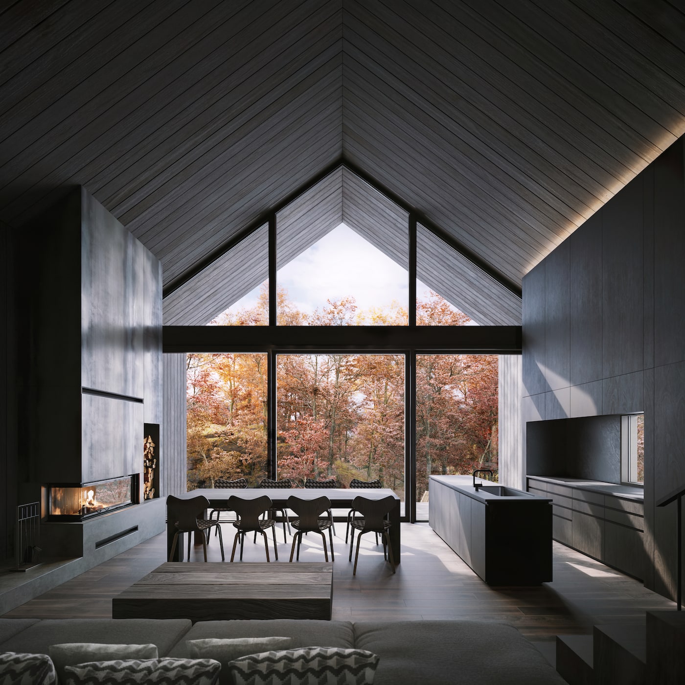 또한 건물을 세로로 긴 구조로 설계해 시각적으로 스케일을 느낄 수 있도록 의도했습니다. 거실에서 테라스의 모닥불 공간까지 이어지는 하나의 연속된 공간 덕분에, 거실에서 밖을 바라보면 공간이 매우 길게 느껴집니다. 반대로 모닥불을 둘러싼다면, 집 내부에서 느낄 수 있는 깊이감이 한층 더해질 것입니다.