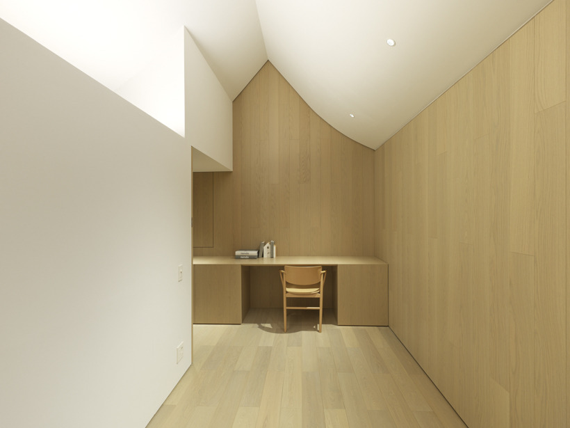 핸드 인 핸드 하우스의 내부는 간결하고 우아한 디자인을 채택하고 있습니다. 벽과 바닥에는 나무 패널이 사용되어 따뜻한 느낌을 주며, 화이트 톤의 천장이 오두막의 지붕 곡선과 일치하는 형태로 설계되었습니다. 내부 가구는 간단한 디자인으로, 회색과 연한 나무 색이 지배적입니다. 이러한 색조와 디자인은 집의 전체적인 미니멀리즘을 유지하면서도, 자연과의 연결을 강조합니다. 집 내부는 편안하고 차분한 분위기를 제공하며, 가족들이 각자의 공간에서 편안하게 시간을 보낼 수 있도록 배려되었습니다.