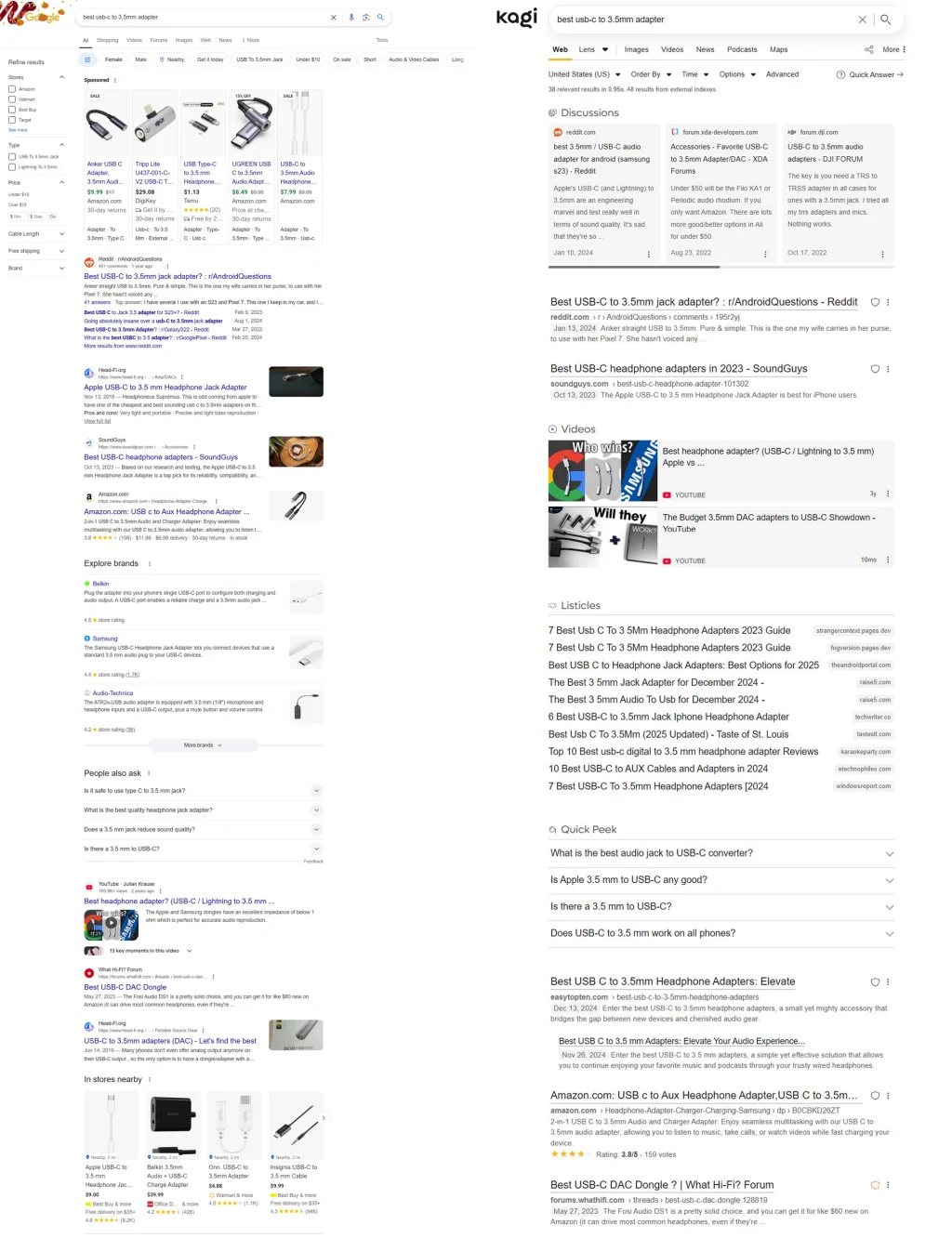 카기는 구글과 차별화된 검색 결과를 제공합니다. 구글은 광고와 추적기가 많은 사이트를 상위에 노출시키는 경향이 있지만, 카기는 광고와 추적기가 적거나 없는 사이트를 우선시합니다. 프레로박은 이러한 사이트들이 대개 고품질 콘텐츠를 제공한다고 주장하며, 카기는 그런 사이트들을 검색 결과의 상위에 배치합니다. 또한 카기는 비상업적인 작은 웹사이트나 개인 블로그, 토론 게시판 등, 구글에서 잘 나타나지 않는 콘텐츠를 강조합니다. 이는 사용자가 더 많은 정보와 다양한 관점을 접할 수 있도록 돕습니다.