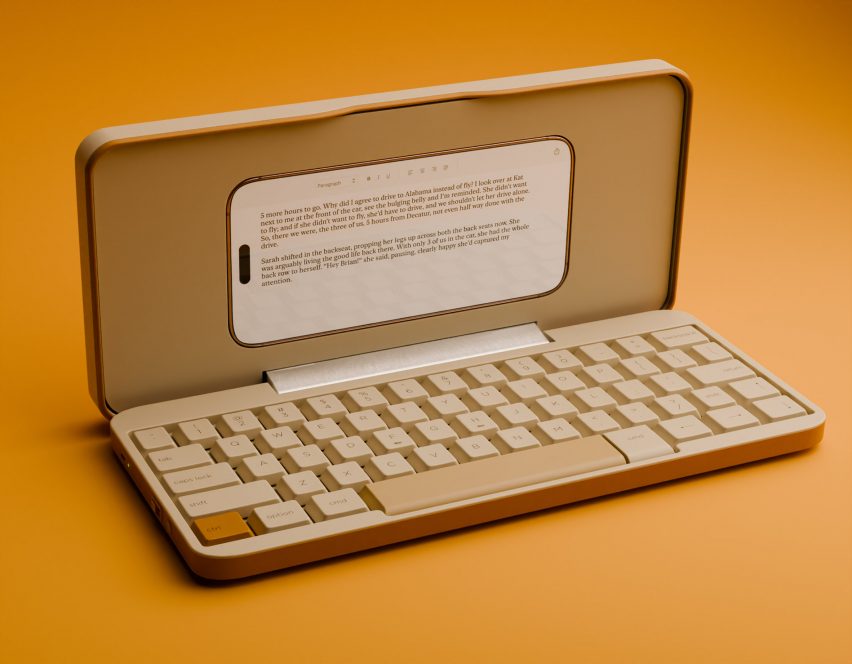 제품 디자이너 저스틴 미첼 (Justin Mitchell)은 휴대용 클램셸 키보드 앰버 KB1 (Amber KB1)을 선보였습니다. 이 콘셉트 키보드는 아이폰 (iPhone)과 삼성 갤럭시 S (Samsung Galaxy S) 시리즈 등 다양한 스마트폰과 호환됩니다. 키보드 상단에 스마트폰을 장착하면 노트북처럼 활용할 수 있도록 설계되었습니다. 미첼은 어디서든 영감을 얻어 글을 쓸 수 있도록 이 키보드를 구상했다고 밝혔습니다. 이 제품은 사용자가 스마트폰을 위한 전용 페이스플레이트를 제공받아 다양한 기기 크기에 대응할 수 있도록 지원합니다.