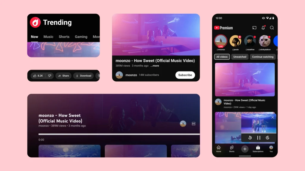 시각 디자인 리드 에이미 입(Amy Yip)은 “레드를 모든 곳에 사용하면 그 힘이 약화된다”고 언급했습니다. 이에 따라 유튜브는 새로운 로고, 트렌딩 아이콘(불꽃 모양), 좋아요 버튼 클릭 시 나타나는 불꽃놀이 애니메이션 등 특정 영역에만 빨간색을 제한적으로 사용하고 있습니다. 이는 브랜드 정체성을 강조하면서도 사용자 눈에 과도한 부담을 주지 않기 위한 시각적 균형을 찾는 시도입니다. 또한 빨간색에 마젠타 그래디언트를 추가해 더욱 현대적이고 신선한 인상을 줄 수 있도록 했습니다. 이처럼 전략적이고 절제된 색상 사용은 미래에도 일관성 있고 쾌적한 사용자 경험을 제공하려는 유튜브의 방향성을 잘 보여줍니다.