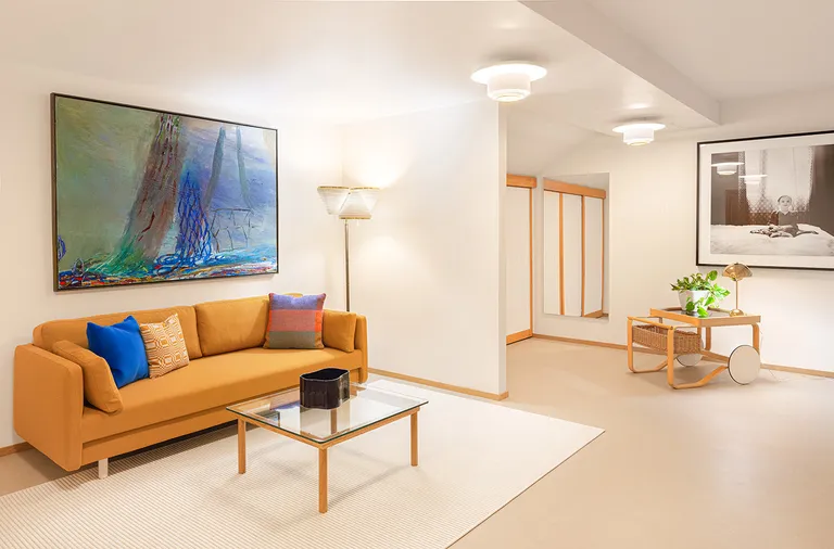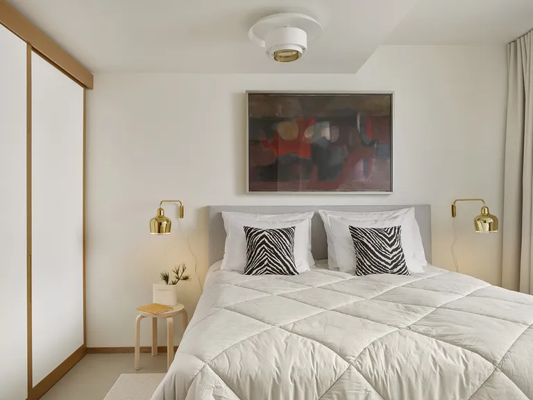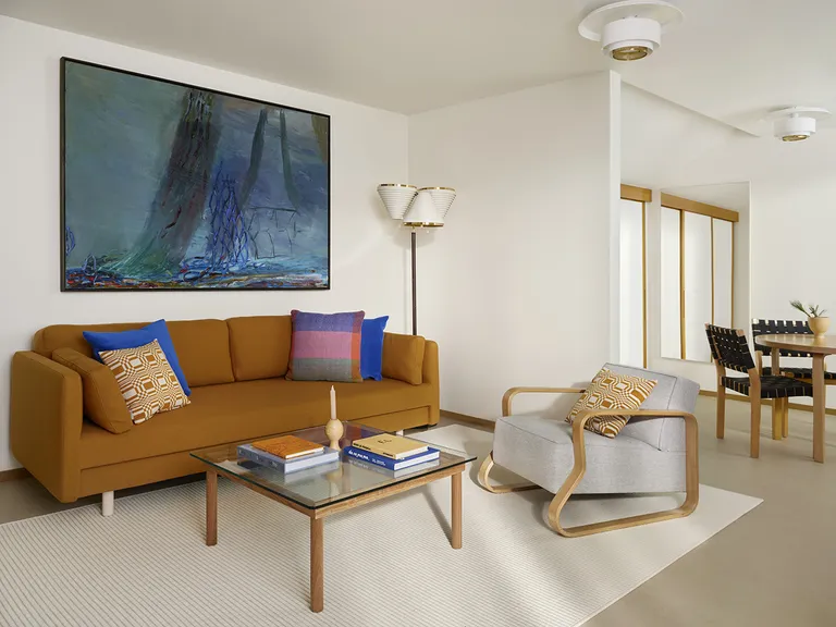 내부는 핀란드 디자인의 명품 가구들로 세련되게 꾸며졌습니다. 헤이(Hay)의 ‘코피(Kofi)’ 커피 테이블과 룬디아(Lundia)의 ‘클래식(Classic)’ 디스플레이 캐비닛 등이 눈길을 끕니다. 또한 &Tradition의 ‘플라워팟(Flowerpot)’ 램프와 피나르테(Finarte)의 ‘팔스타(Palsta)’ 쿠션이 공간에 독특한 감각을 더합니다. 각 가구는 알바 알토의 원래 의도를 반영하며 모던한 감각과 전통이 조화를 이룹니다. 이와 같이 선정된 가구들은 숙박 공간의 품격과 예술적 매력을 한층 더 높였습니다.
