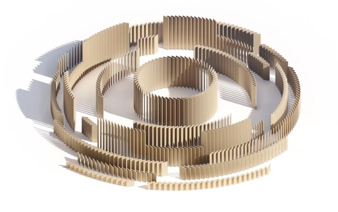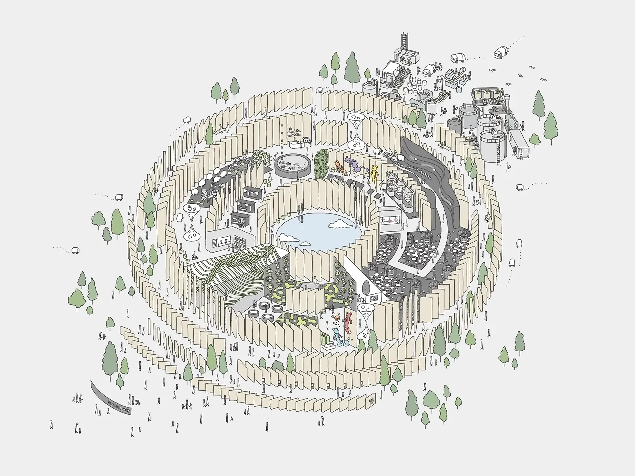 일본관은 수많은 목재 패널이 만들어내는 거대한 원형 구조로 이루어진다. 정확히 말하자면, 260개의 교차 적층 목재(CLT) 패널이 사용된다. 이 원형 구조는 생명의 순환을 상징하며, 개최국인 일본관의 독특한 존재감을 드러낸다. 관람객들은 목재 틈새로 내부의 모습을 엿볼 수 있고, 이를 통해 '사이'에 존재하는 것들에 대한 이해와 영감을 얻을 수 있다. 설계는 닛켄 세케이가 맡았으며, 넨도의 오키 사토가 전체를 총괄했다. (출처: 스푼&타마고 원문 링크)