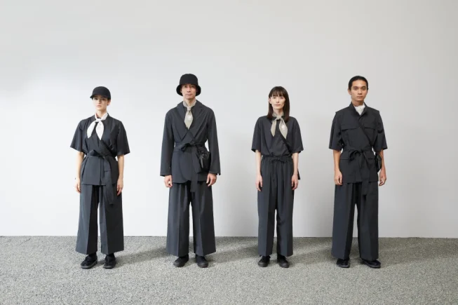 일본관의 안내원은 개최국인 일본을 대표하는 핵심적인 역할을 수행하며, 관람객을 맞이하면서 다양한 임무를 수행하게 된다. 그들이 우아하면서도 스타일리시하게 이러한 역할을 수행할 수 있도록, 패션 브랜드 「포스트엘리건트(Postelegant)」의 디자이너 타나카 유야(Yuya Tanaka)가 유니폼을 디자인했다. 유니폼은 일본 전통 기모노의 구조에서 영감을 받아 디자인되었으며, 성별과 나이를 초월하여 누구나 입을 수 있도록 만들어졌다. 일본 특유의 미의식을 담고 있으며 아름다움과 기능성의 균형을 강조한다. 또한 착용감이 편안하고, 내열성이 뛰어나며 환경 친화적인 소재로 만들어졌다. 식물성 폴리에스터 섬유와 사용 후 폐PET병에서 재활용한 섬유를 사용해 제작된다. (출처: 스푼&타마고 원문 링크)