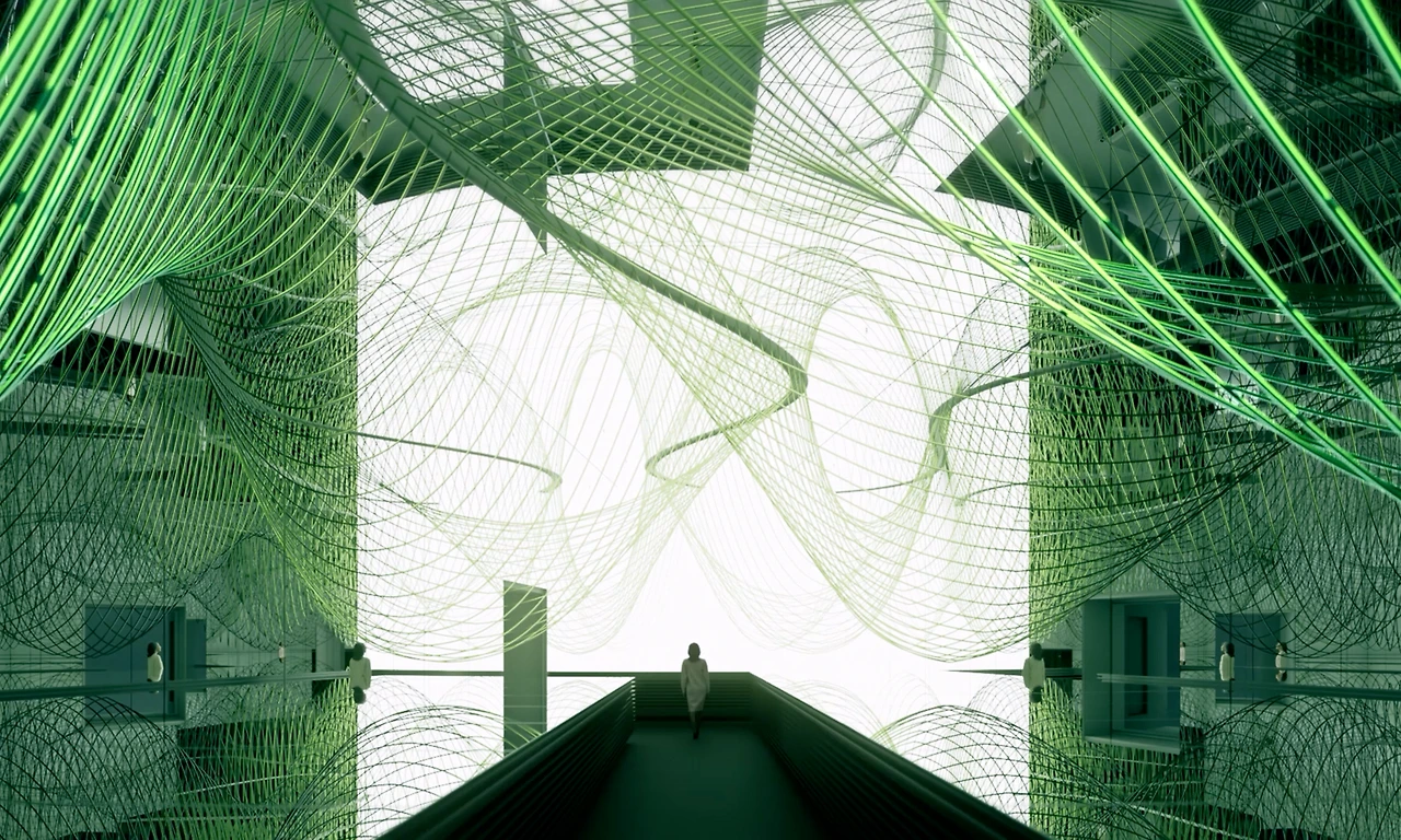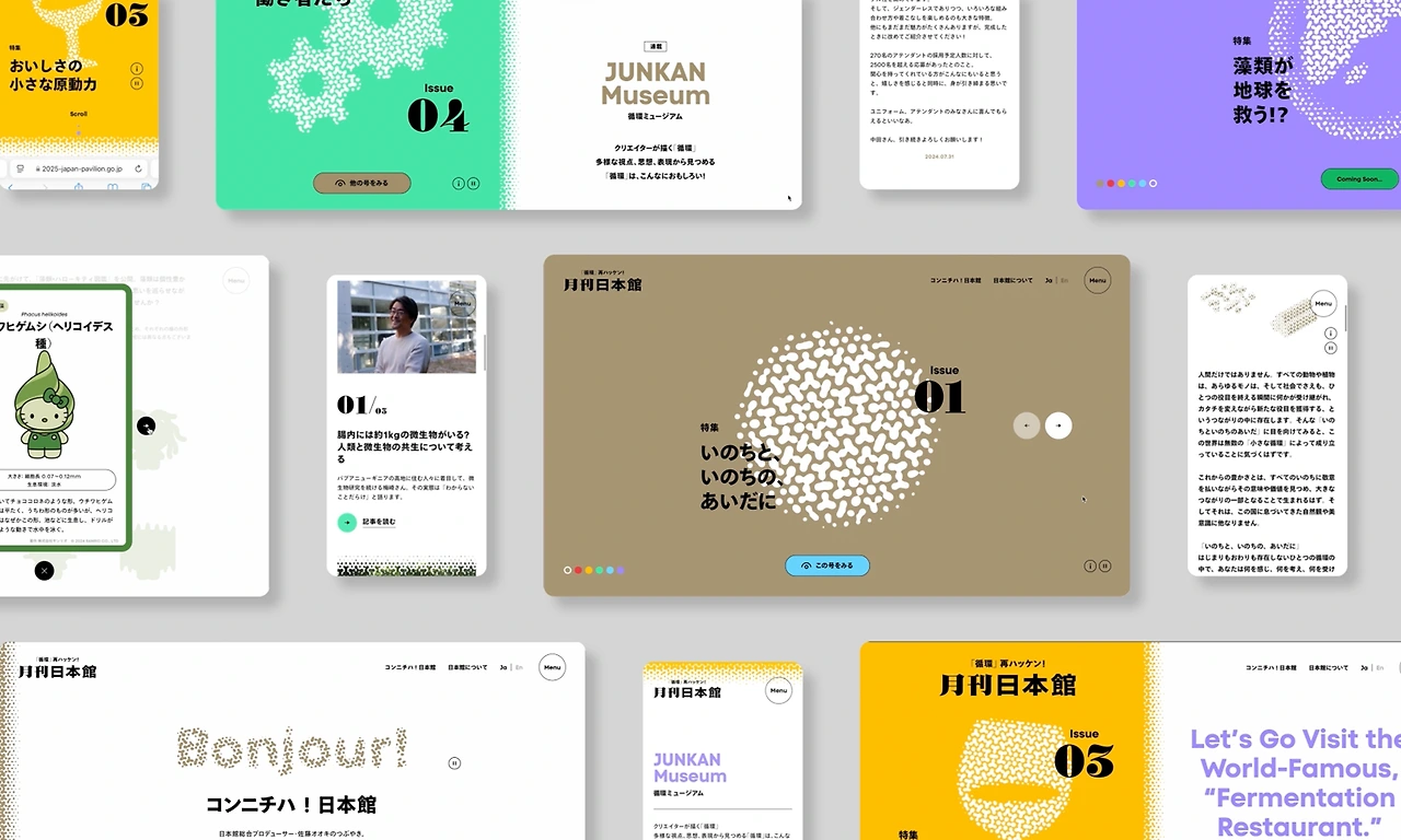 그래픽 디자이너 이로베 요시아키가 만든 일본관의 시각 시스템은 또 다른 형태의 살아있는 유기체다. 이 시스템은 마치 숨 쉬고 자라나듯 끊임없이 분열과 융합을 반복하며 늘 변화한다. 그것은 '생명과 생명 사이'에 시선을 돌리게 하려는 일본관의 목적을 나타내며, 방문객들에게 단순한 디자인이 아닌 하나의 과정으로 기억되게 만든다. (출처: 스푼&타마고 원문 링크)