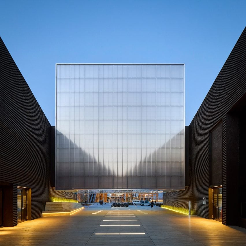 건물 내부의 협곡 형태 벽면에는 미국의 상징적인 이미지를 담은 대형 LED 스크린이 설치되어 있습니다. 카우보이 모자를 쓴 기수, 성조기 이미지 등이 큐브 외벽의 반투명 패널에 은은하게 반사되어 시각적 깊이를 더합니다. 구조 외벽은 목재 슬랫으로 마감되었으며, 큐브를 지나면 정원으로 이어지는 좁은 통로가 나옵니다. 이 공간은 전시관 내에서 가장 조용하고 사적인 공간으로 설계되어 있습니다. 전체적인 동선은 개방성과 몰입감을 동시에 전달합니다.